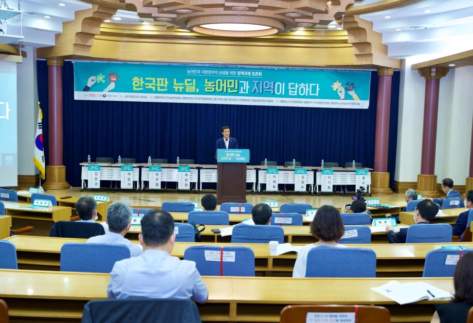 전국농어촌지역군수협의회(회장 홍성열 증평군수), 전국농어민위원회(위원장 위성곤 국회의원), 대통령소속 자치분권위원회(위원장 김순은), 국가균형발전위원회(위원장 김사열), 농어업농어촌특별위원회(위원장 정현찬)는 7월 30일 서울 영등포구 국회의사당 국회의원회관 제1소회의실에‘한국판 뉴딜, 농어민과 지역이 답하다’라는 주제로 토론회를 개최했다.