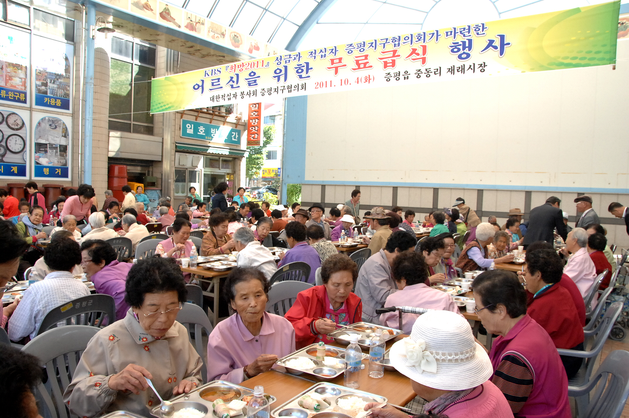 대한적십자봉사회 증평지구협의회(협의회장 송호열) 주관으로 4일(화) 오전 10시부터 증평재래시장 광장에서 “사랑의 점심 나누기” 봉사활동이 진행되었다.[보도자료실 참조]