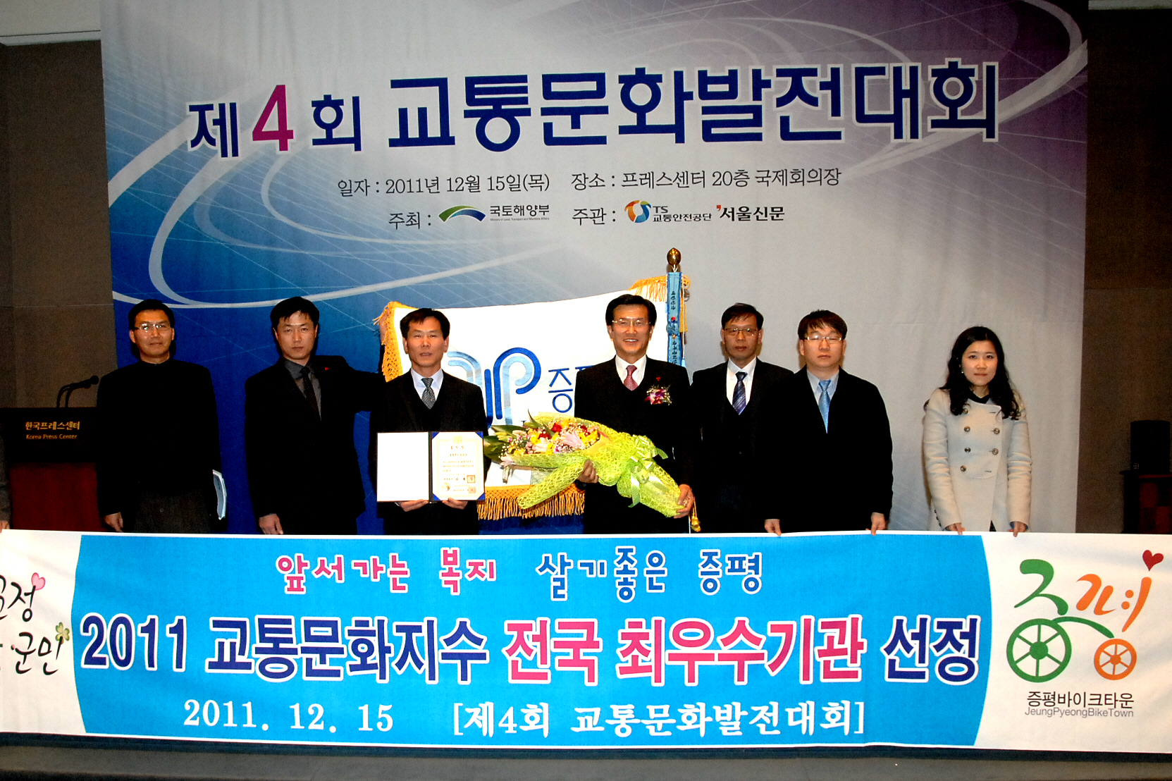 국토해양부 주최, 교통안전공단 및 서울 신문사 공동 주관으로 15일 한국프레스센터 국제 회의장에서 열린 제4회 교통문화발전대회에서 증평군이 2011 교통문화지수 전국 최우수기관으로 선정돼 국무총리상을 수상했다.[보도자료실 참조]