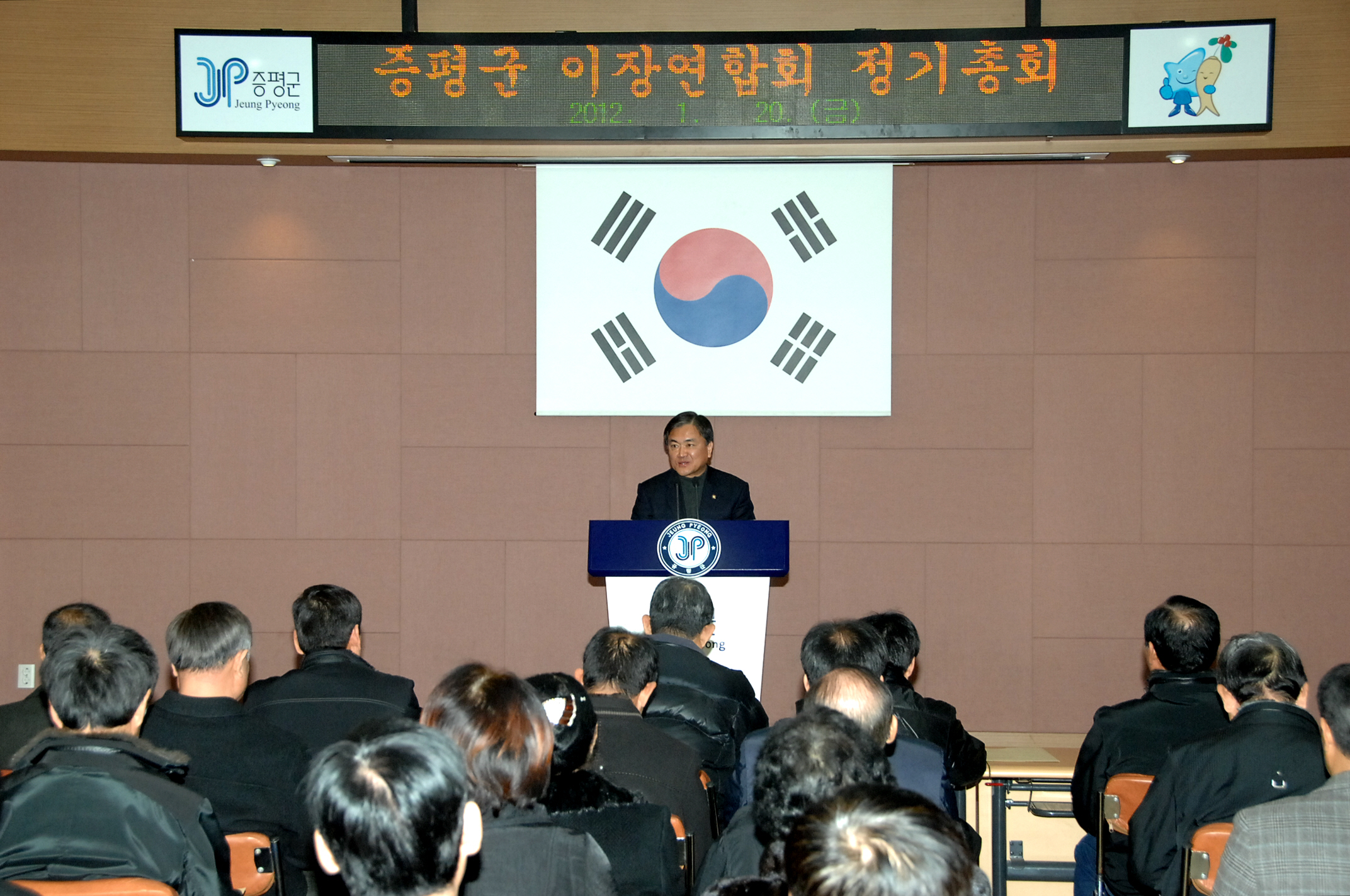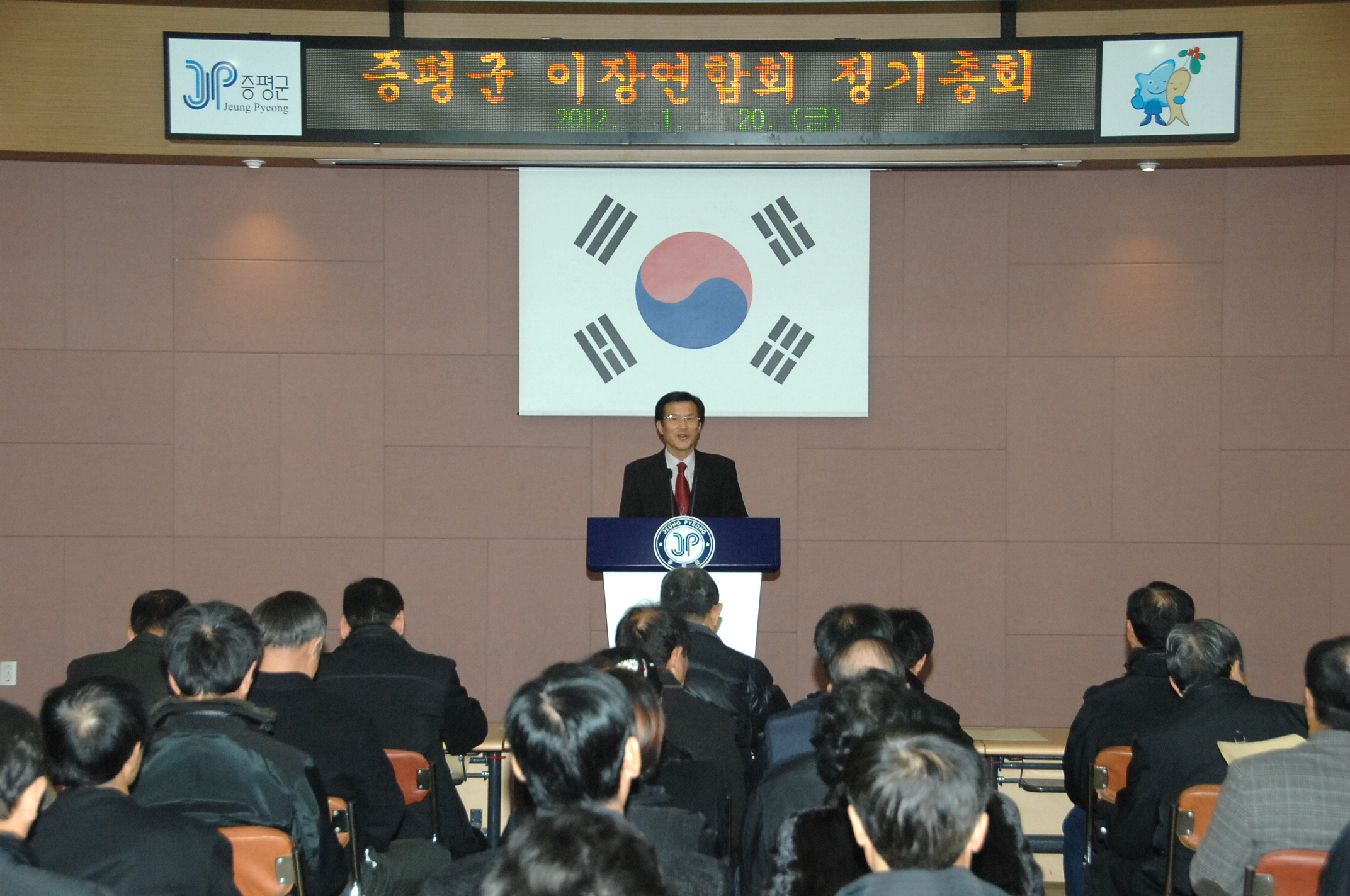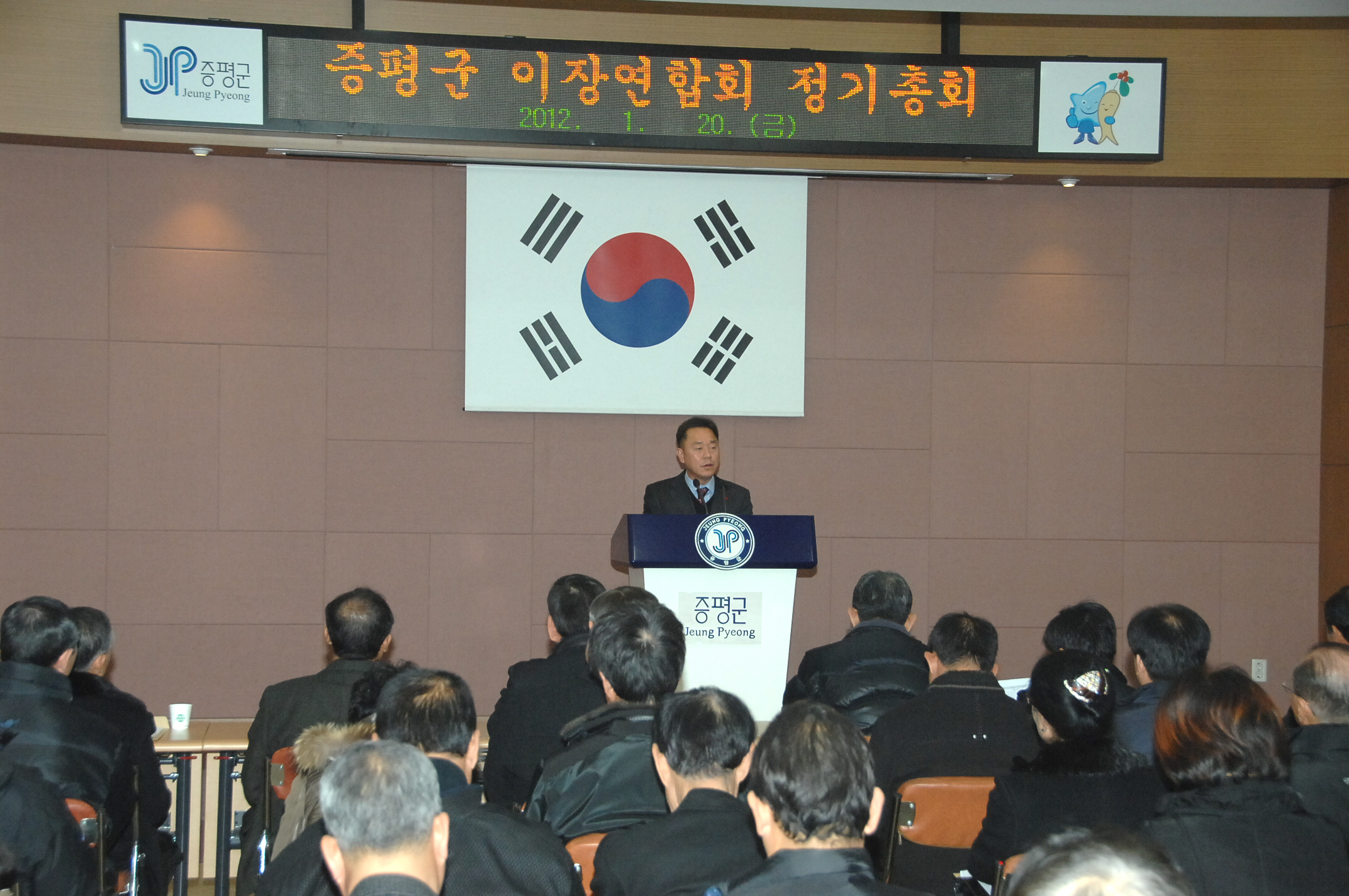 증평군이장연합회(회장 연태희)는 20일 오전 11시 군청 대회의실에서 홍성열 군수, 김재룡 군의회 의장, 정범구 국회의원 등이 참석한 가운데 2012년 새해를 맞아 정기총회를 개최했다.[보도자료실 참조]]