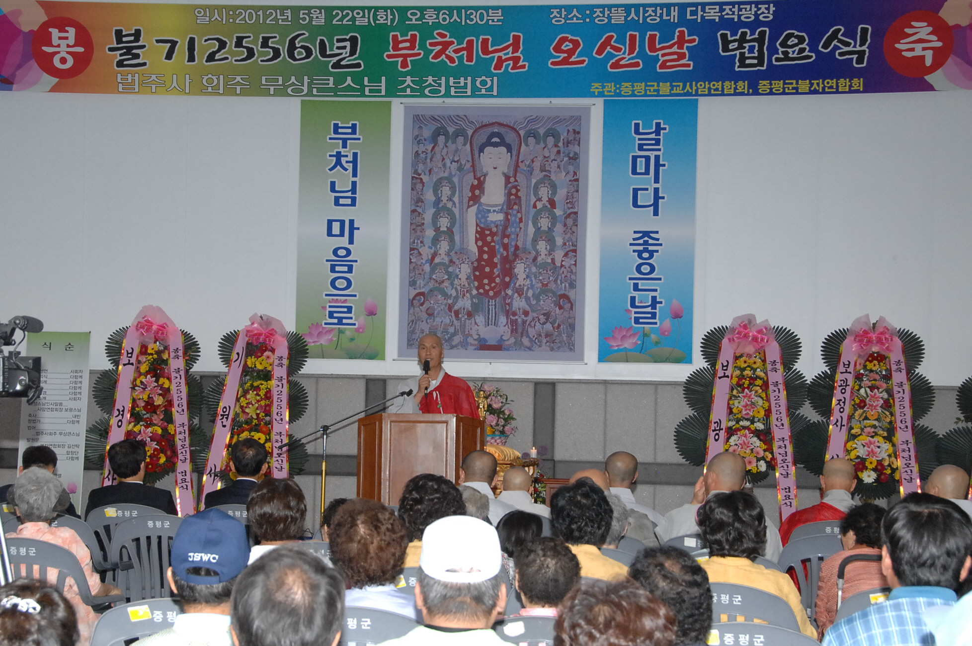 불기2556년 부처님 오신 날 법요식이 22일 오후 6시 30분 장뜰시장내 다목적 광장과 시가지 일원에서 증평군사암연합회(회장.보광스님)와 증평군불자연합회(회장.김선탁) 주관으로 열렸다.