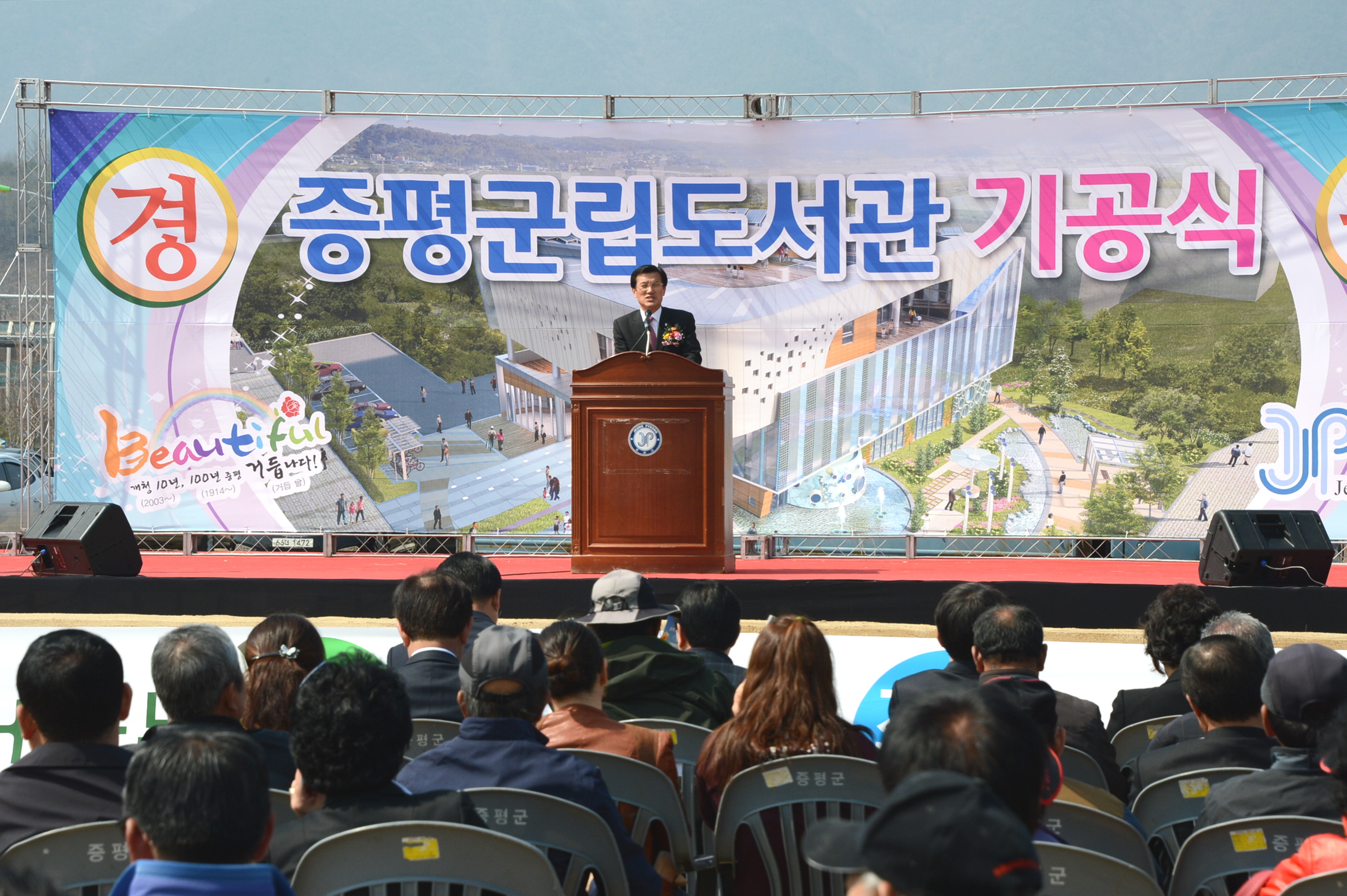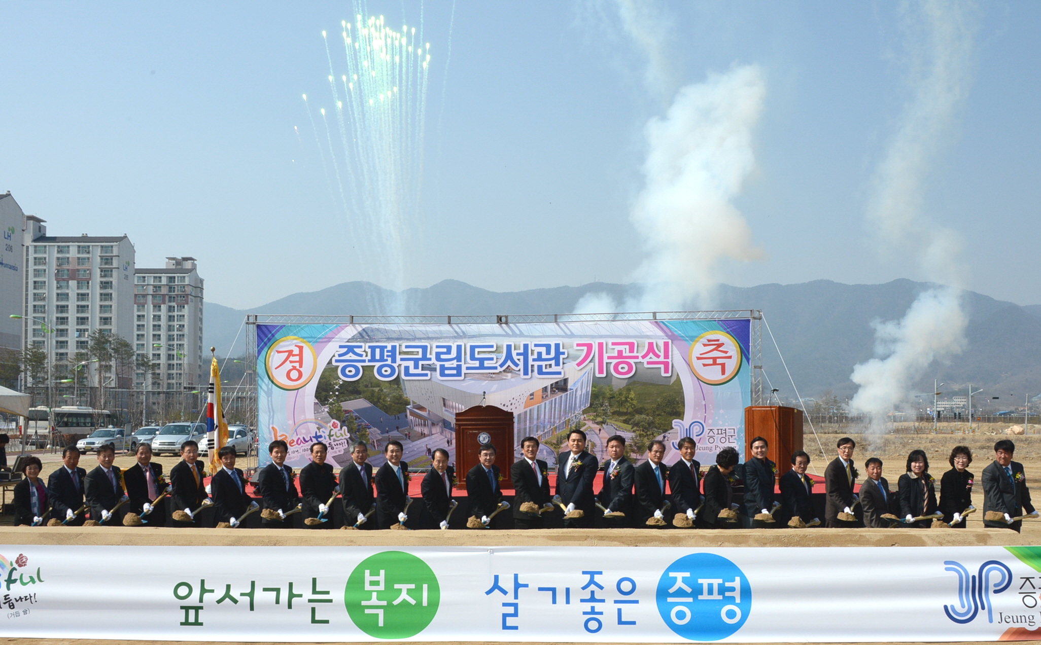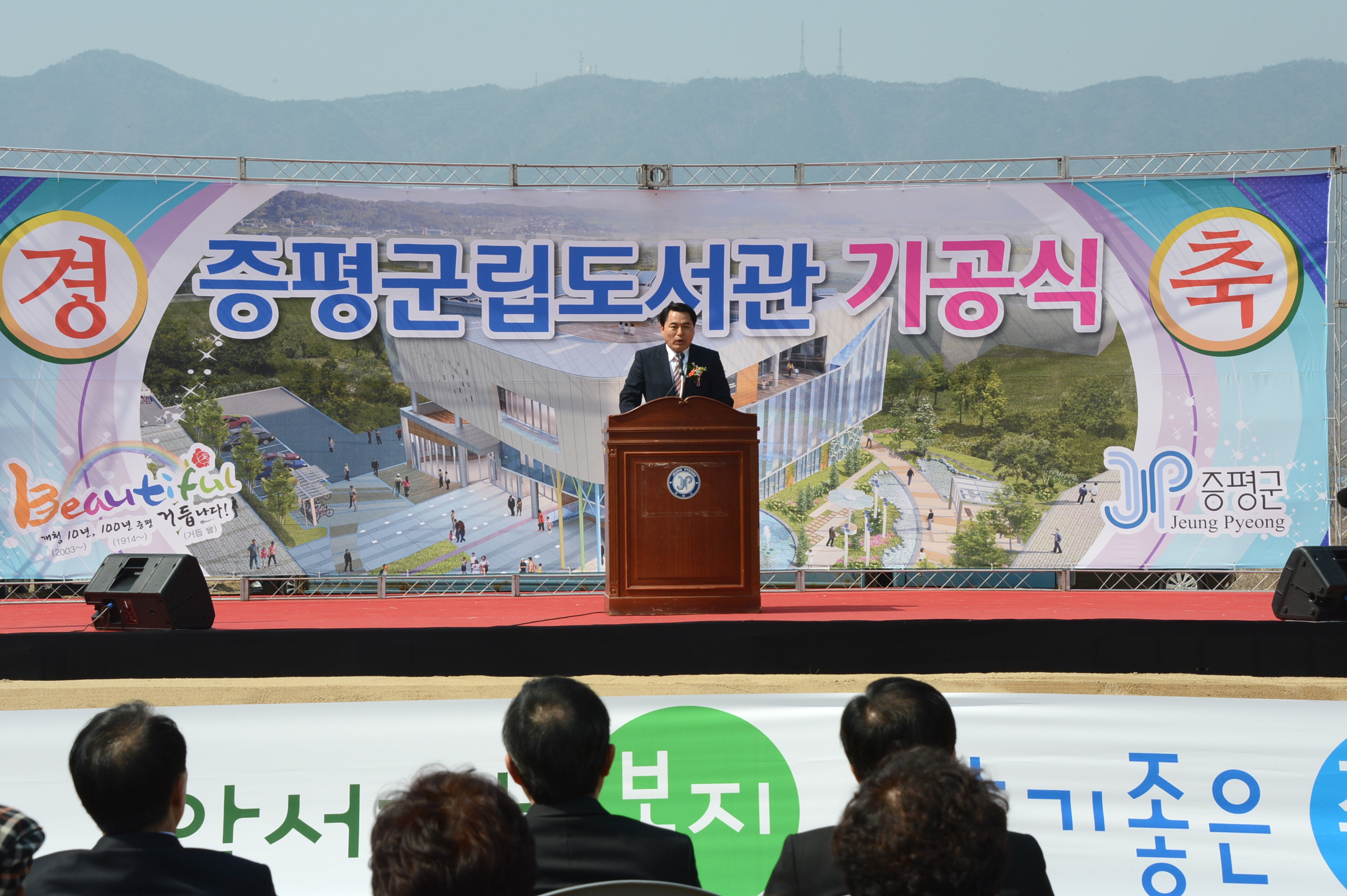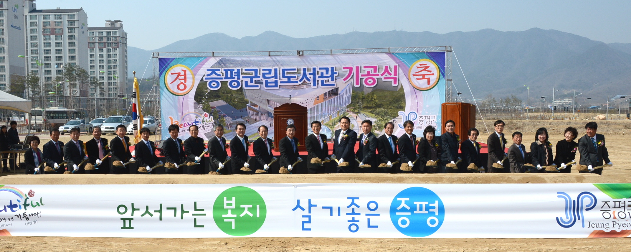 증평군은 3일 오후 2시 도서관 신축예정지인 증평읍 송산리 816번지에서 홍성열 증평군수, 경대수 국회의원을 비롯해 지역인사, 주민 250여명이 참석한 가운데 주민들의 오랜 숙원인 증평군립도서관 신축 기공식을 가졌다. [보도자료실 참조]