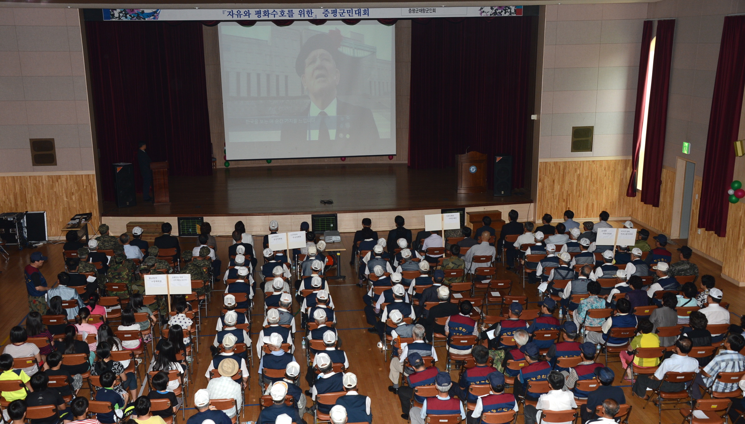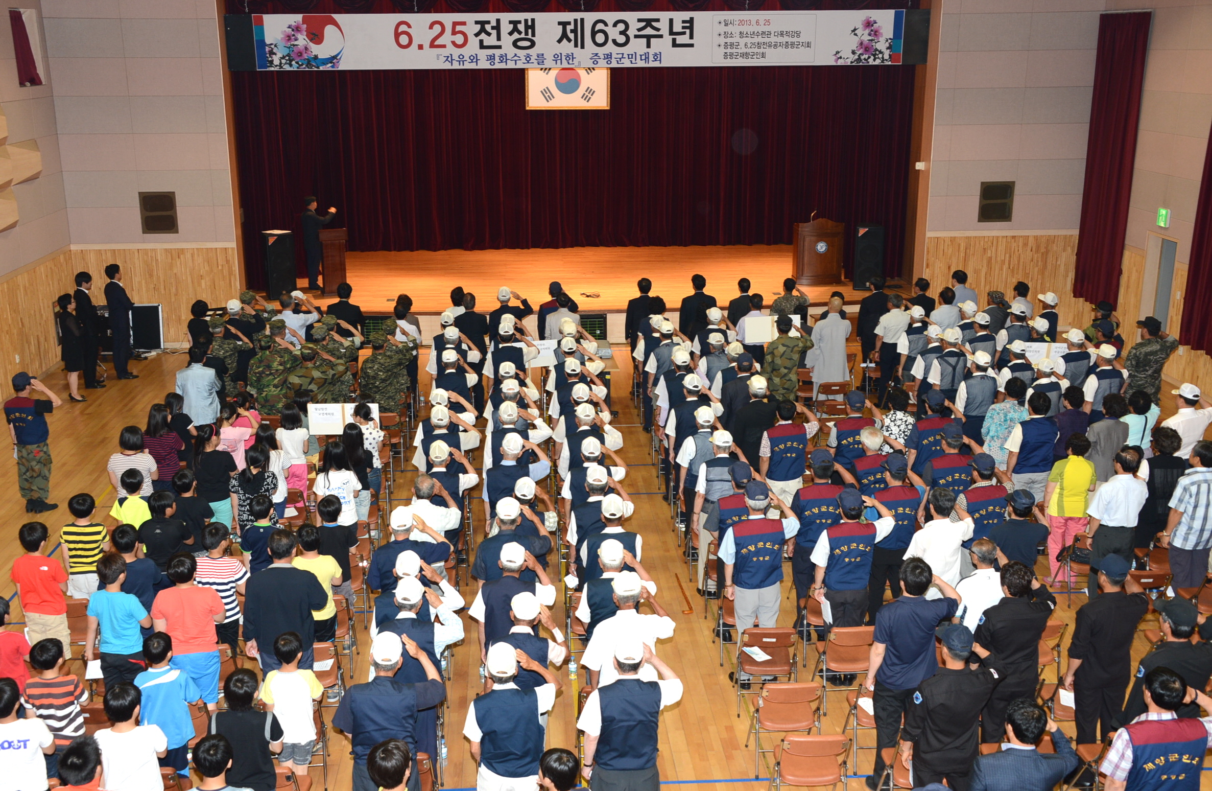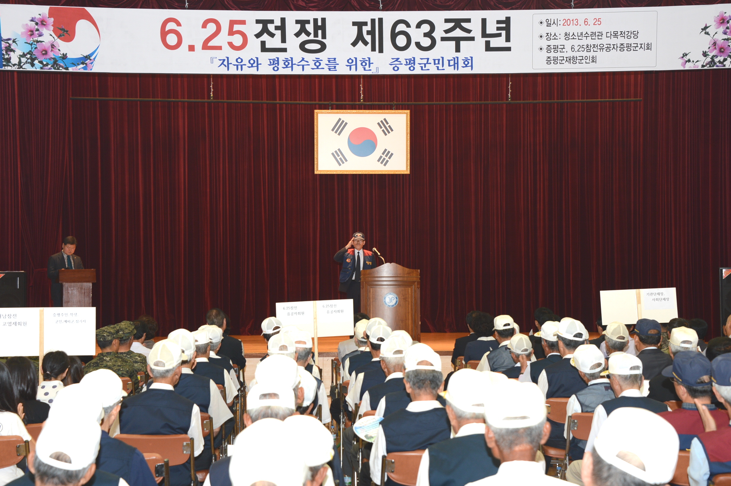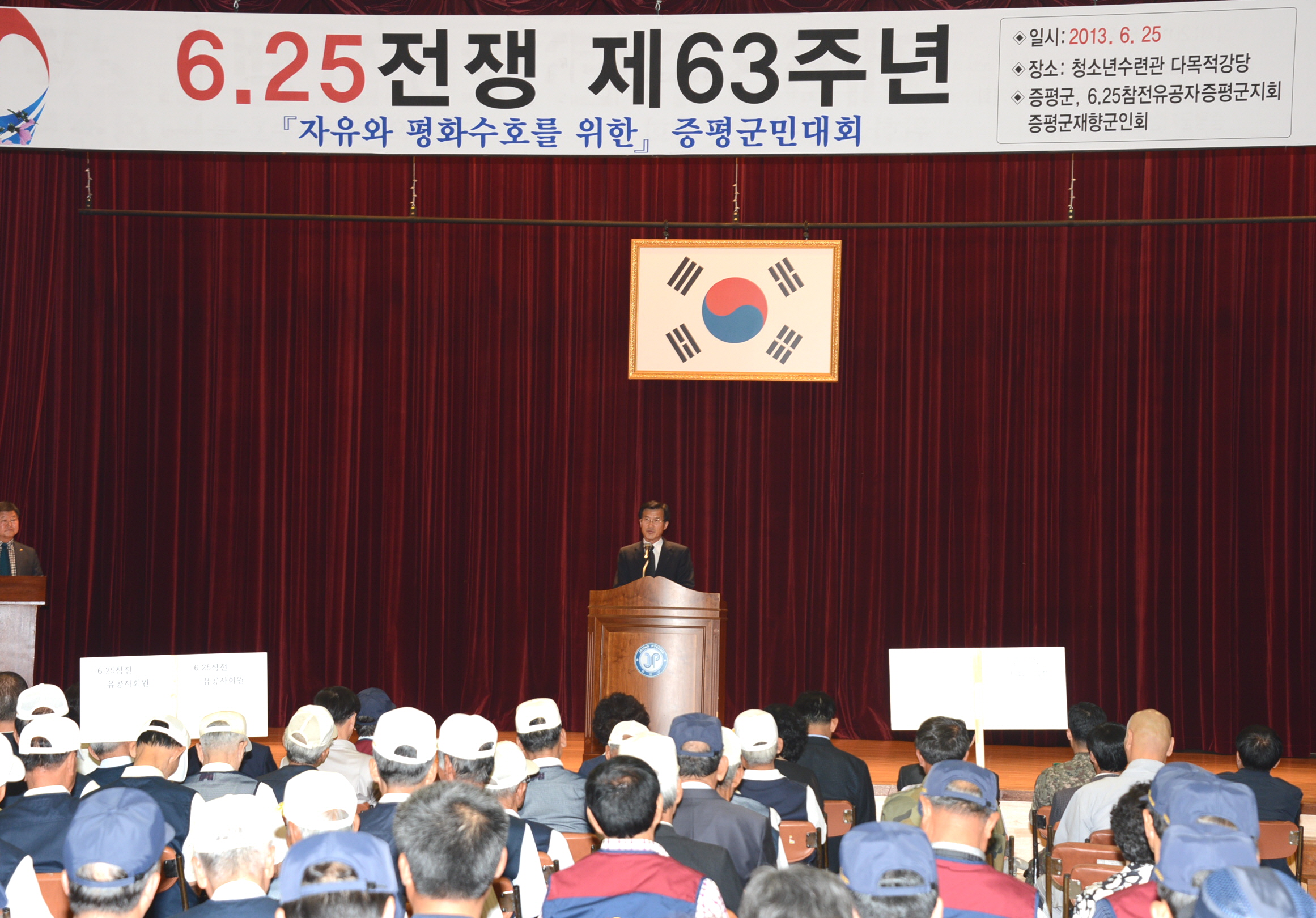 6.25전쟁 63주년 기념행사가 25일 오전 11시 증평읍 내성리 청소년수련관에서 홍성열 군수, 박석규 군의장과 군의원, 육재동 재향군인회장, 정은영 6.25참전유공자회장을 비롯해 보훈단체 회원 및 주민 300여명이 참석한 가운데 열렸다. [보도자료실 참조]
