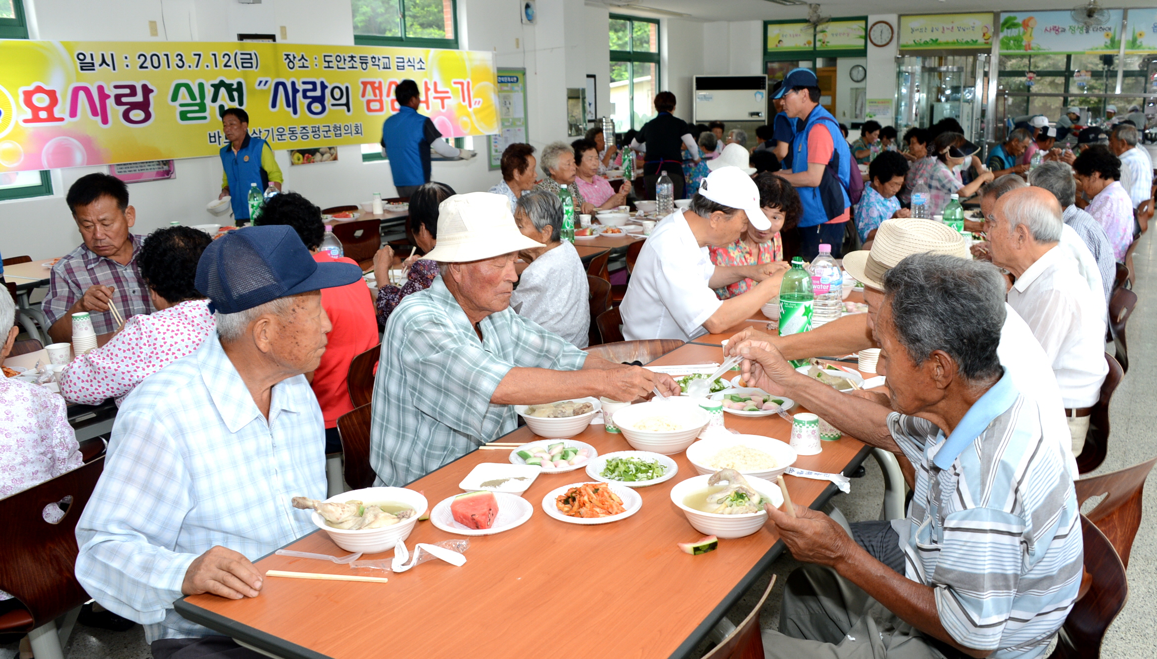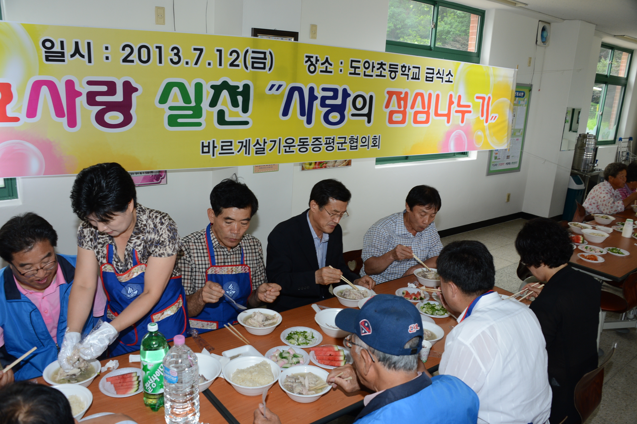 바르게살기운동증평군협의회(회장 이상욱)는 12일 오전 12시 30분 도안초 급식소에서 독거노인 및 어르신 500명을 초청해 무더운 여름철을 건강히 지낼 수 있도록 ‘孝, 사랑의 점심 나눠주기’ 행사를 열었다. [보도자료실 참조]
