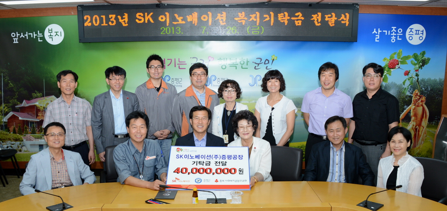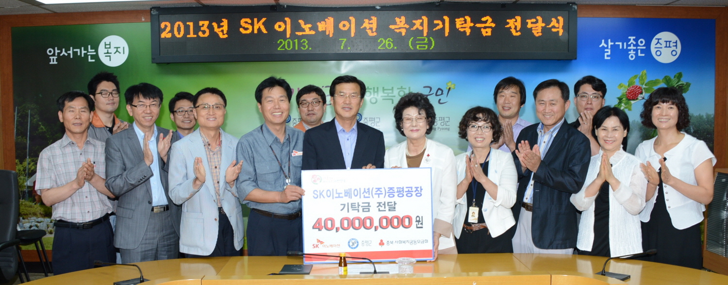 SK이노베이션(주)(대표 구자영)은 26일 오전 11시 30분 군청 소회의실에서 홍성열 증평군수, SK이노베이션(주) 김형욱 증평공장장, 충북사회복지공동모금회장 송옥순 등 관계자 15여명이 참석한 가운데 증평군에 사랑의 복지기탁금 4,000만원을 전달했다. [보도자료실 참조]