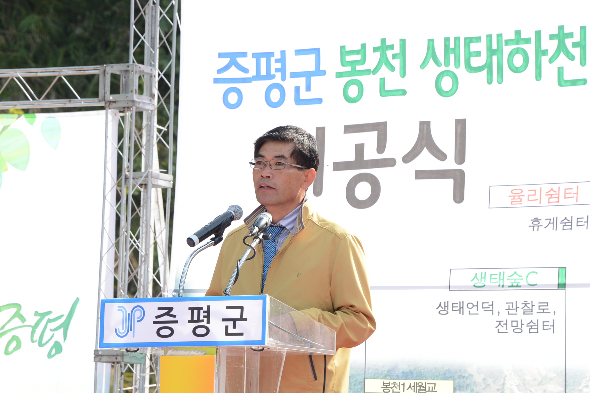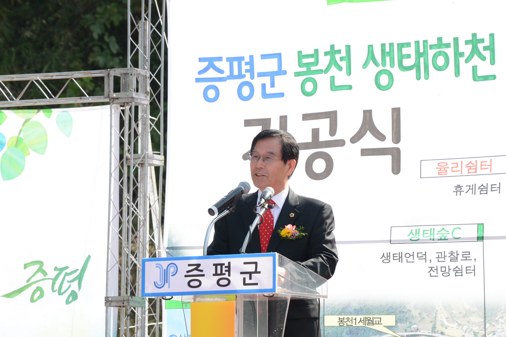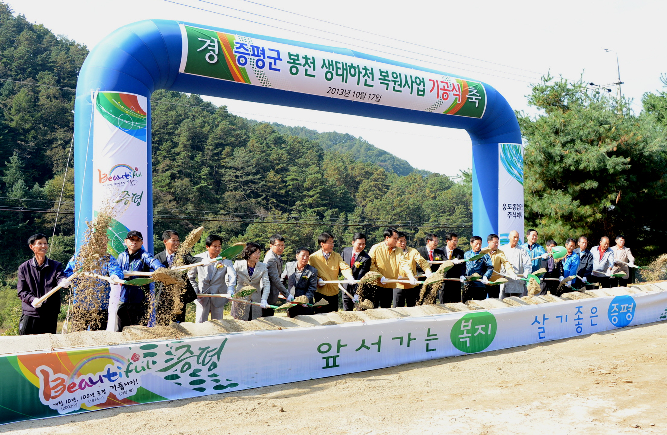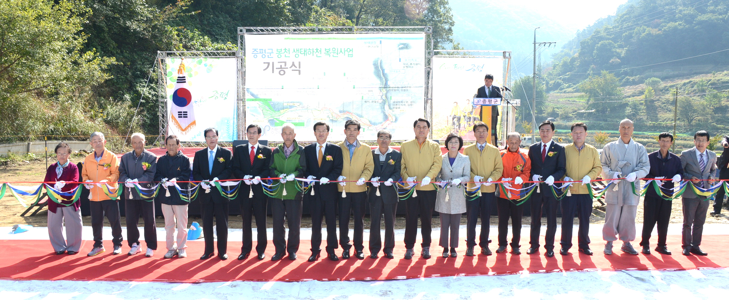 증평군은 17일 오전 10시 증평읍 율리 337번지에서 홍성열 증평군수를 비롯해 증평군의회 박석규 의장과 군의원 및 각 기관단체장, 감리사대표, 시공사대표, 지역주민 등 150여명이 참석한 가운데 ‘봉천 생태하천 복원사업 기공식’을 가졌다. [보도자료실 참조]