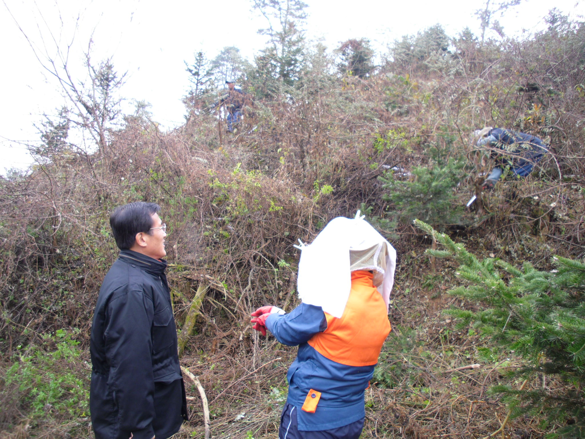 홍성열 증평군수가 19일 증평읍 미암리 산 44-1번지 산림바이오매스 산물수집 현장을 방문해 한파로 인한 안전사고 주의를 당부하고 수집단원들을 격려했다. [증평보도자료실 참조]