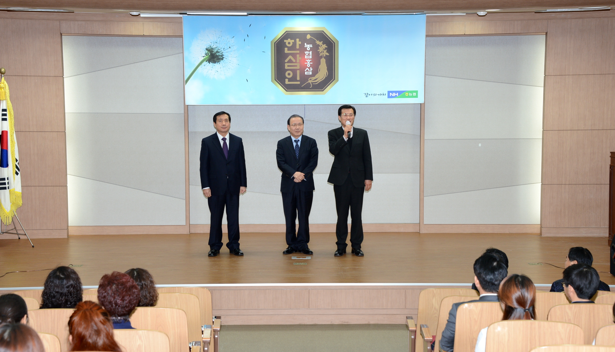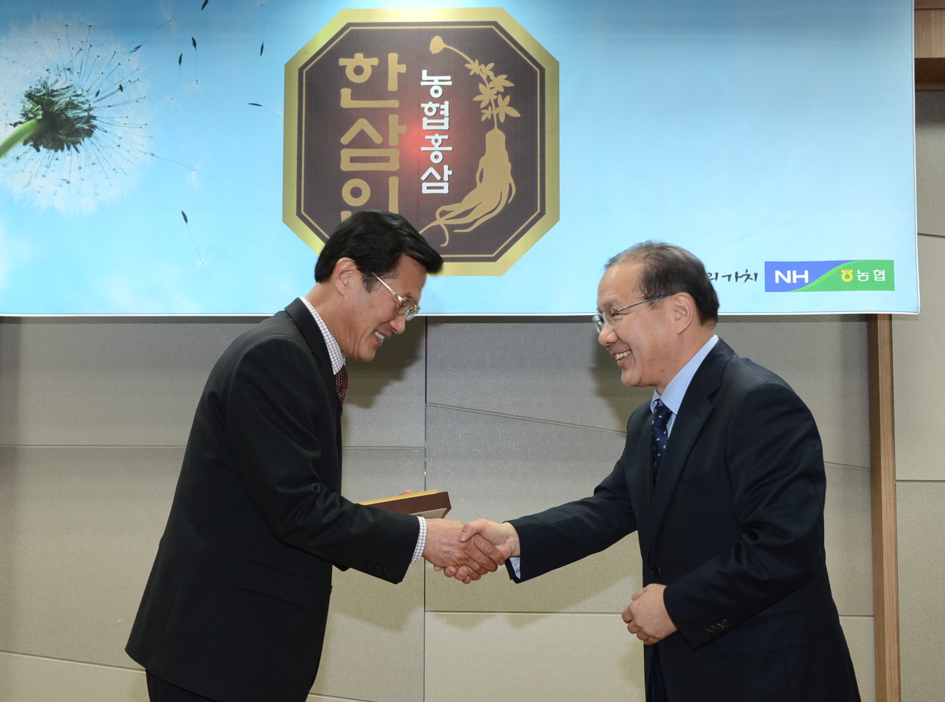 홍성열 증평군수가 4일 인삼산업 발전에 기여한 공로로 2014년 농협중앙회 회장(최원병)으로부터 감사패를 받았다. [보도자료실 참조]