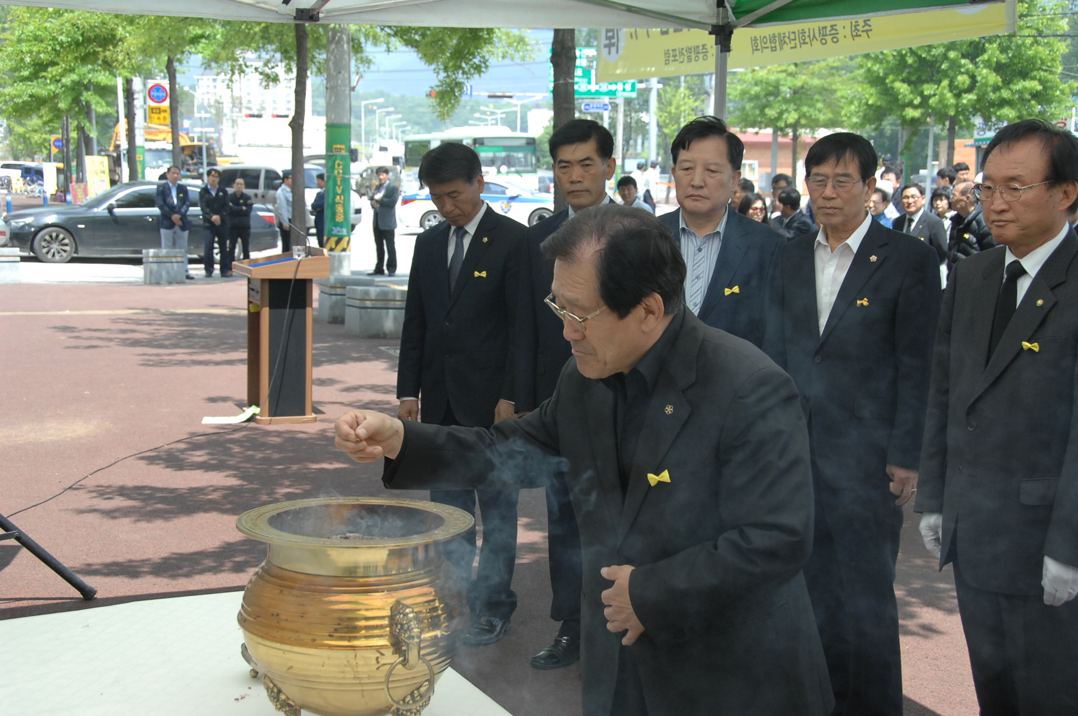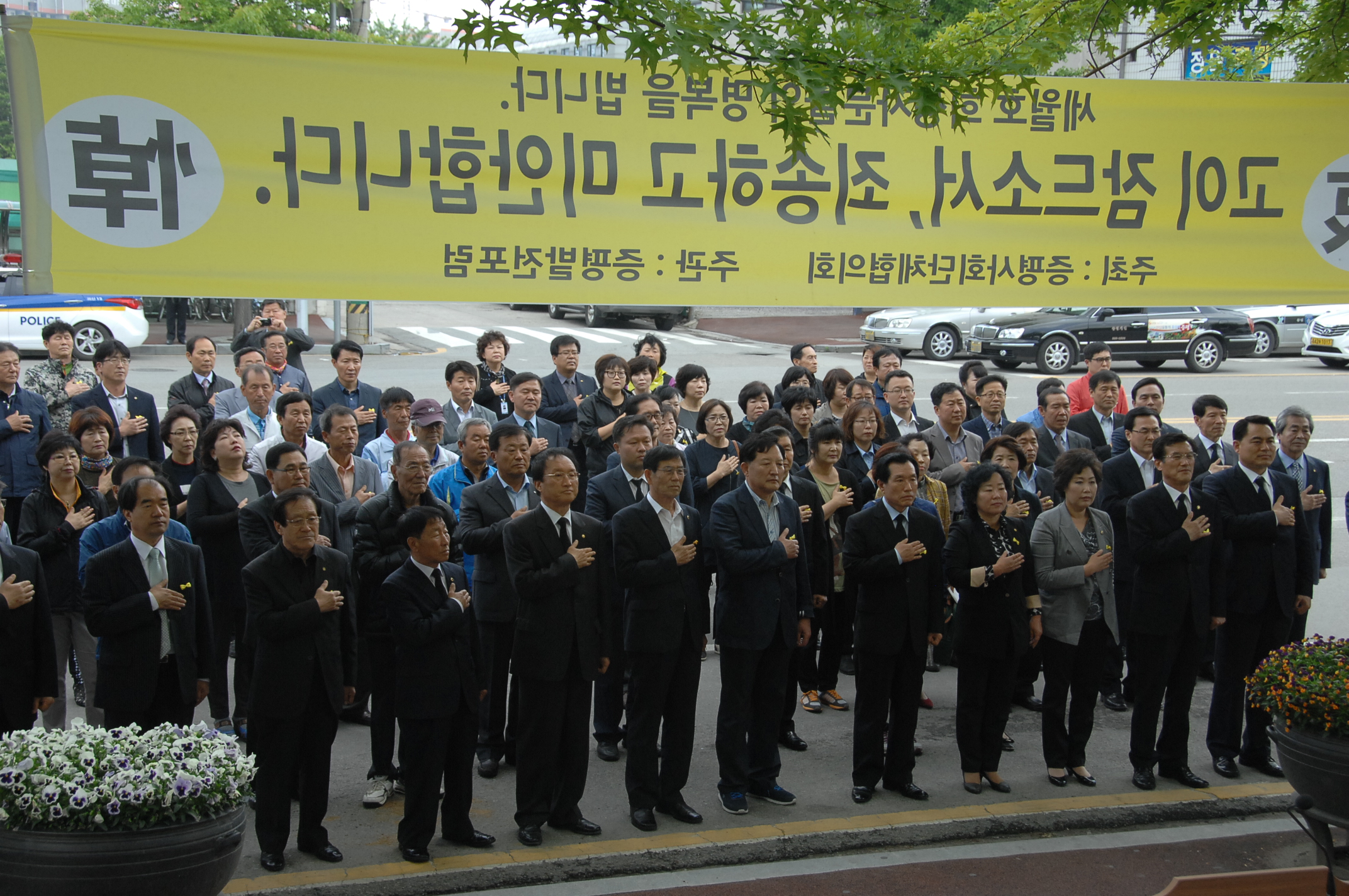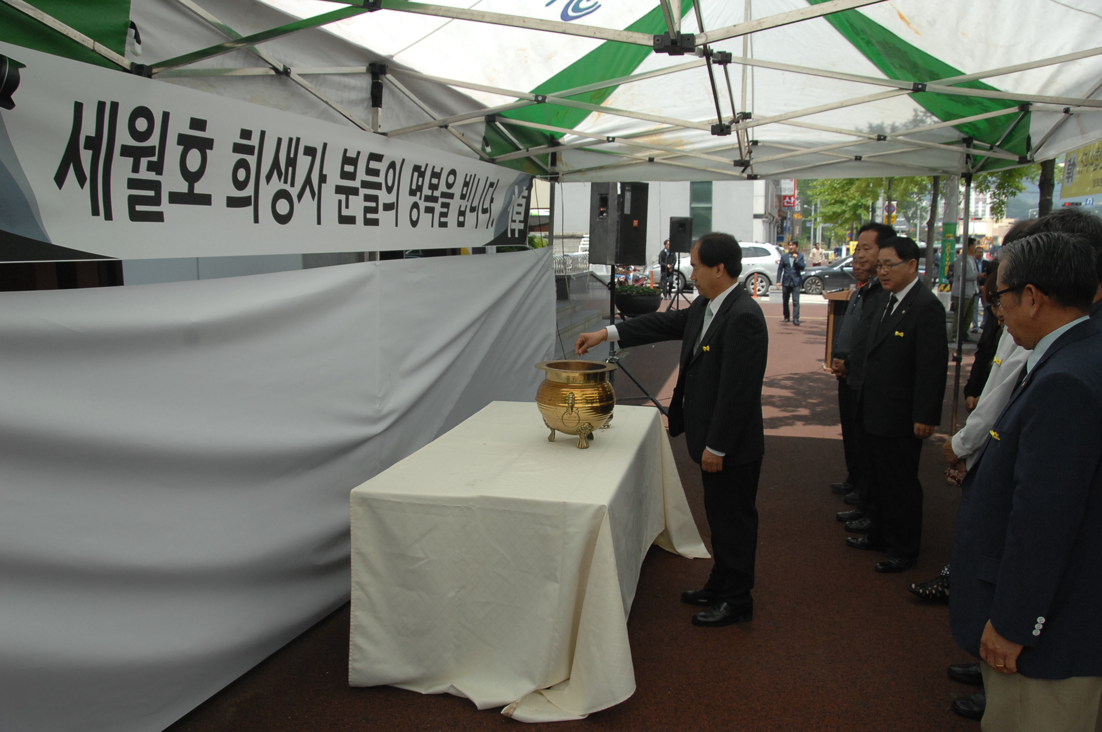 증평군 사회단체협의회와 증평발전포럼은 12일 오전 11시 증평군청 민원과 앞에서 세월호 참사 희생자들의 넋을 기리고 무사 귀환을 기원하는 추도식을 열었다. [증평보도자료실 참조]