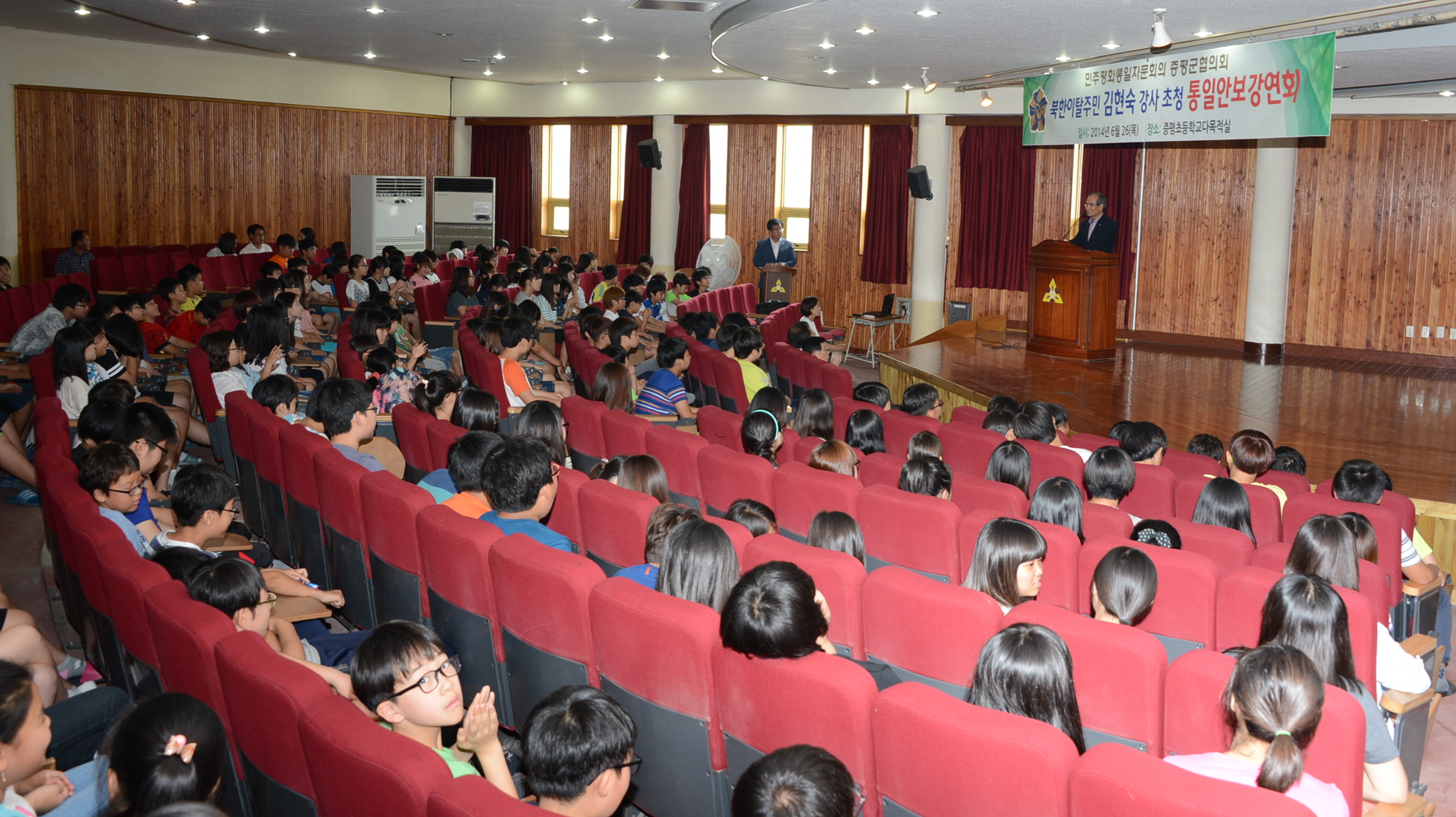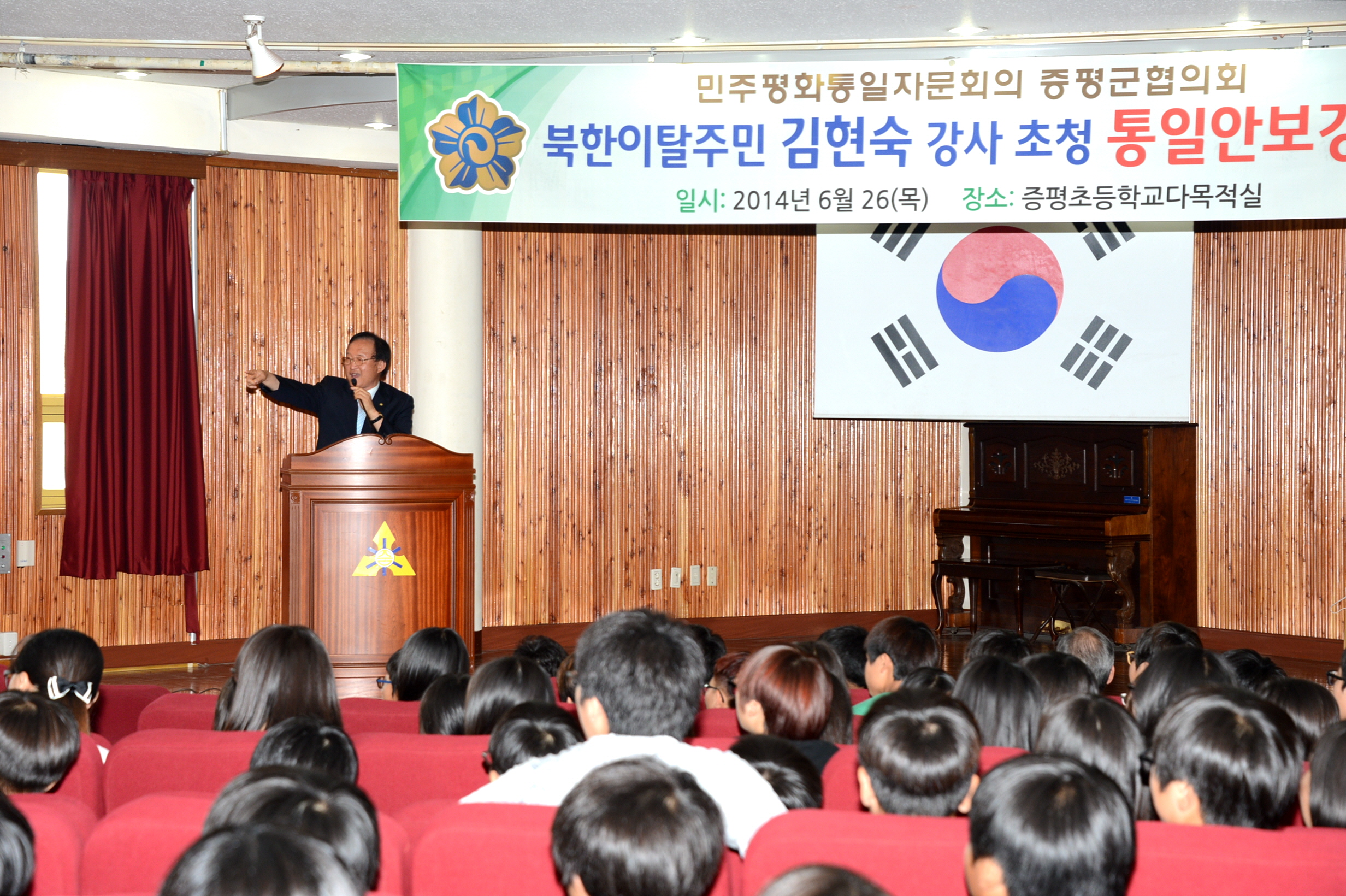 민주평통 증평군협의회(회장 김장응)는 26일 6.25 64주년을 맞아 증평초 다목적실에서 6학년 학생 300여명을 대상으로 북한이탈주민 김현숙 강사를 초청해 북한의 실상을 알리는 강연회를 가졌다. [보도자료실 참조]