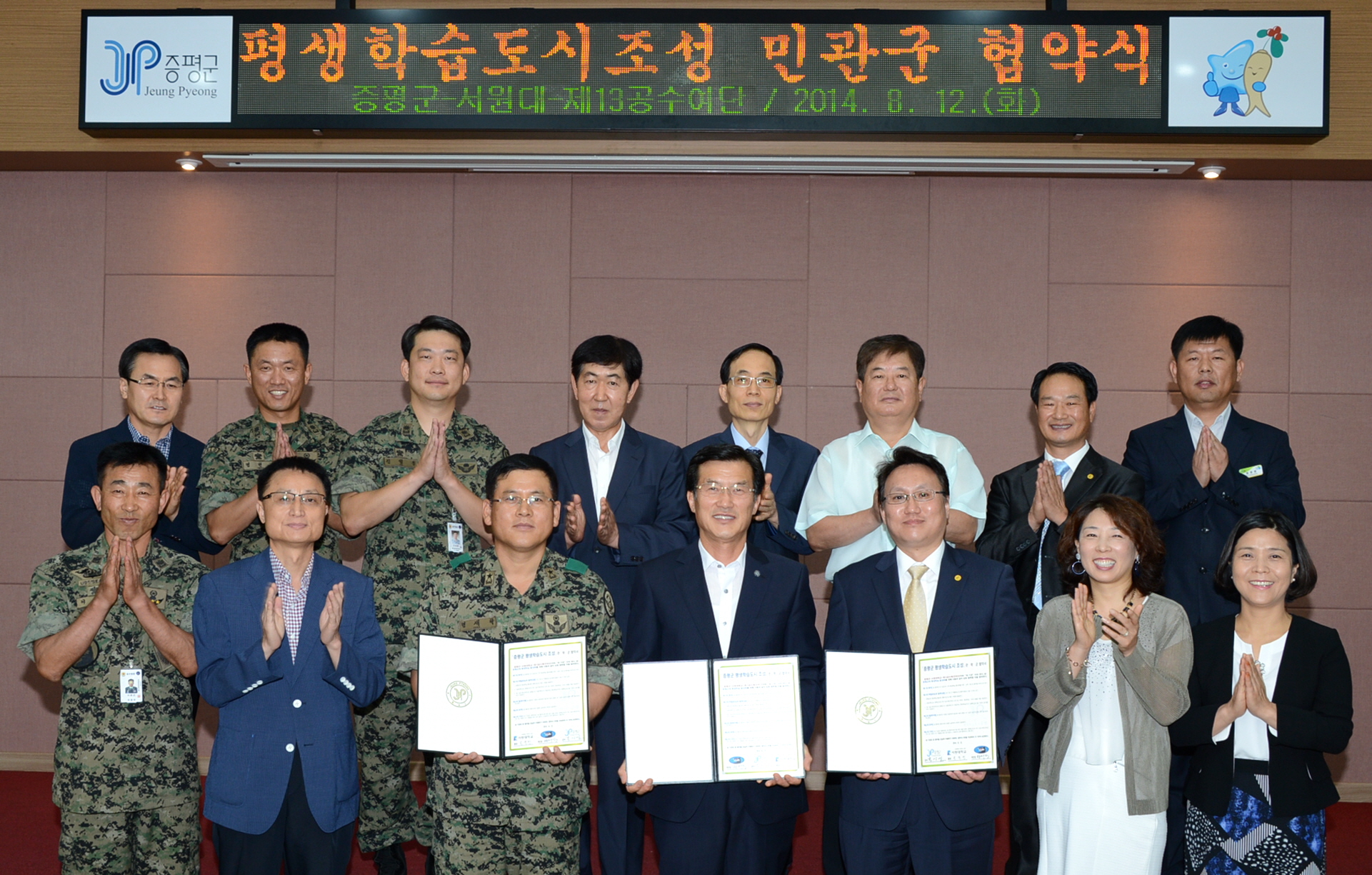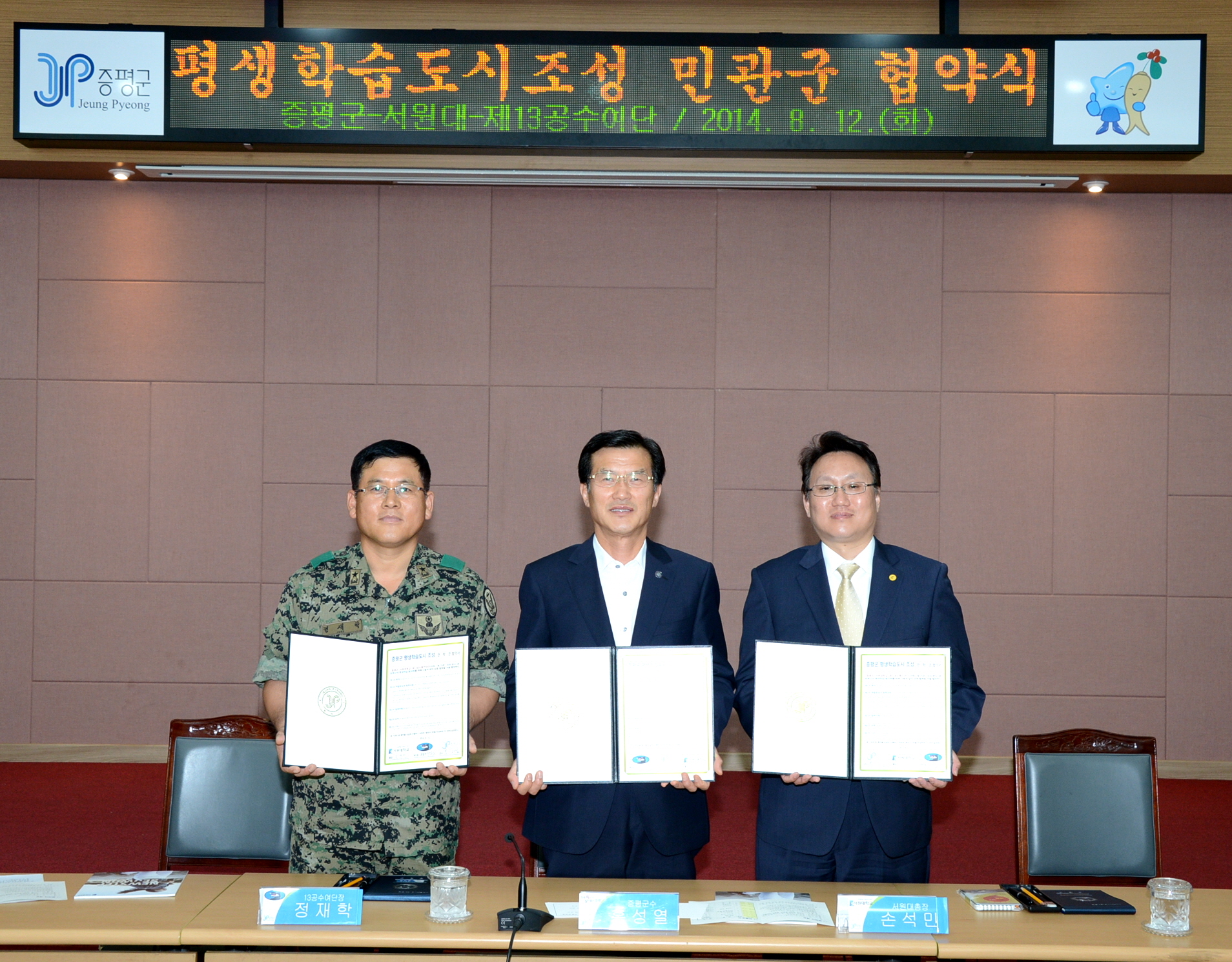 증평군은 12일 오전11시30분 군청 대회의실에서 2014년도 평생학습도시 선정에 따른 지역평생교육 활성화를 위해 관․학․군 협력 협약을 체결했다. [보도자료실 참조]