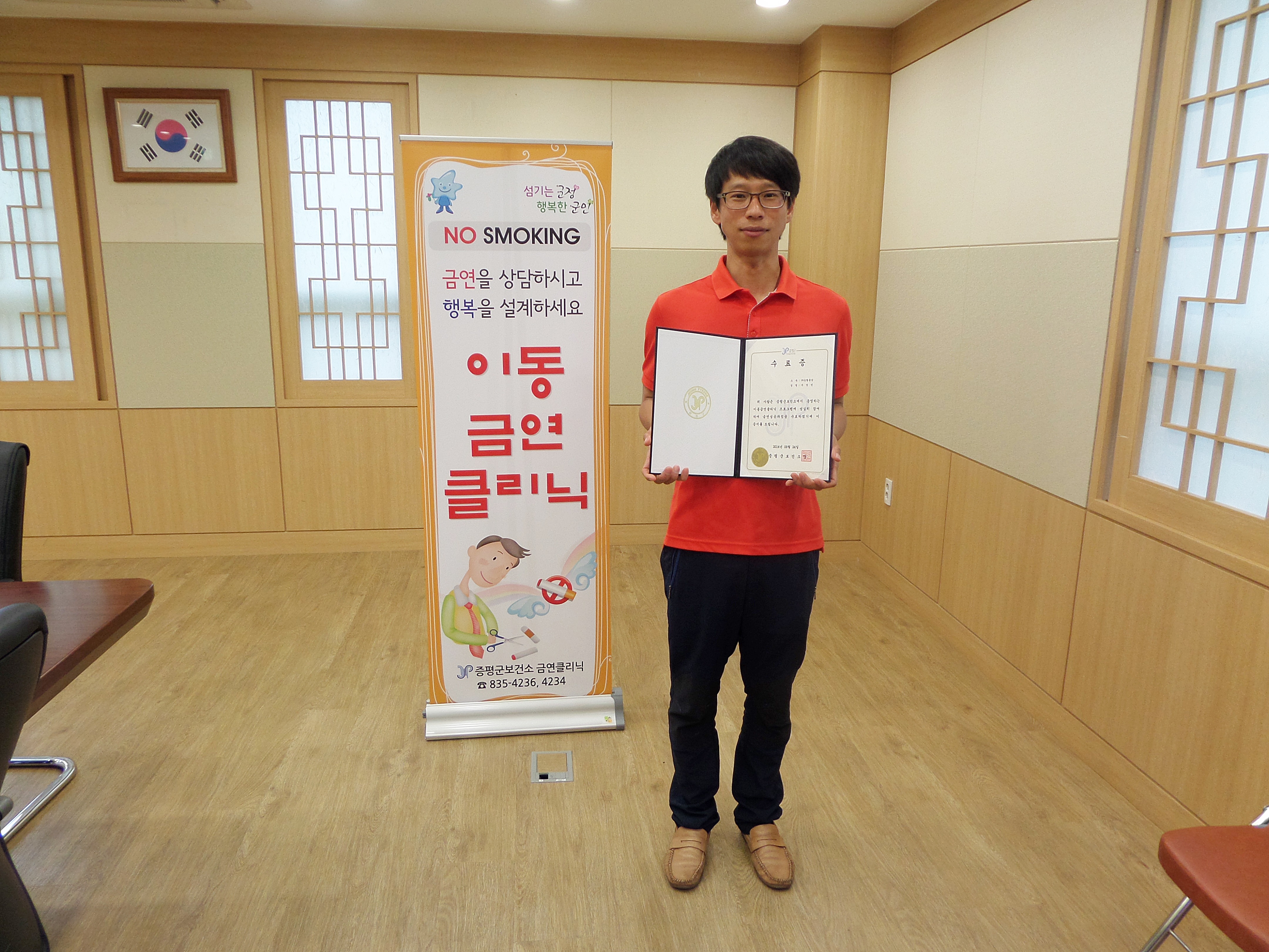 증평군보건소는 25일 증평읍 초중리에 위치한 ㈜농협홍삼에서 6개월 프로그램 과정을 수료하고 니코틴 잔류검사를 통해 금연 성공자로 확인된 직원에게 수료증을 전달했다. [증평보도자료실 참조]