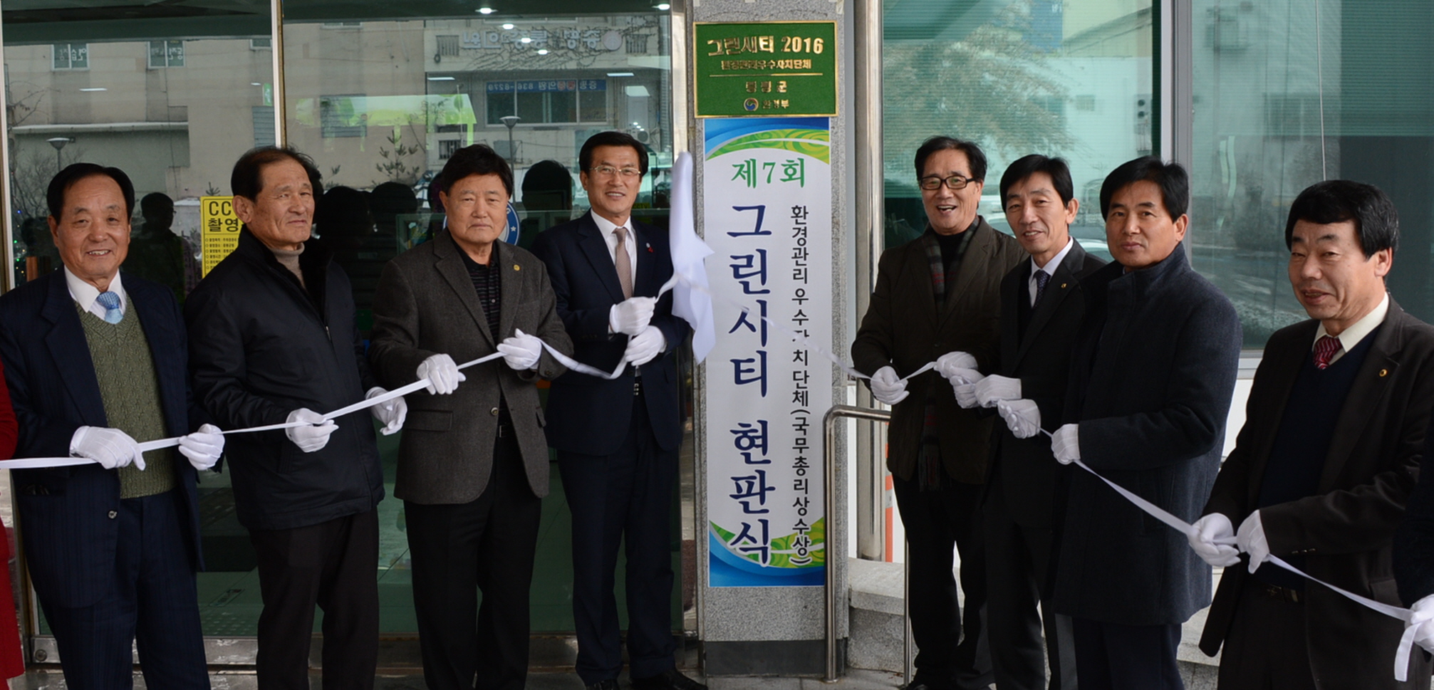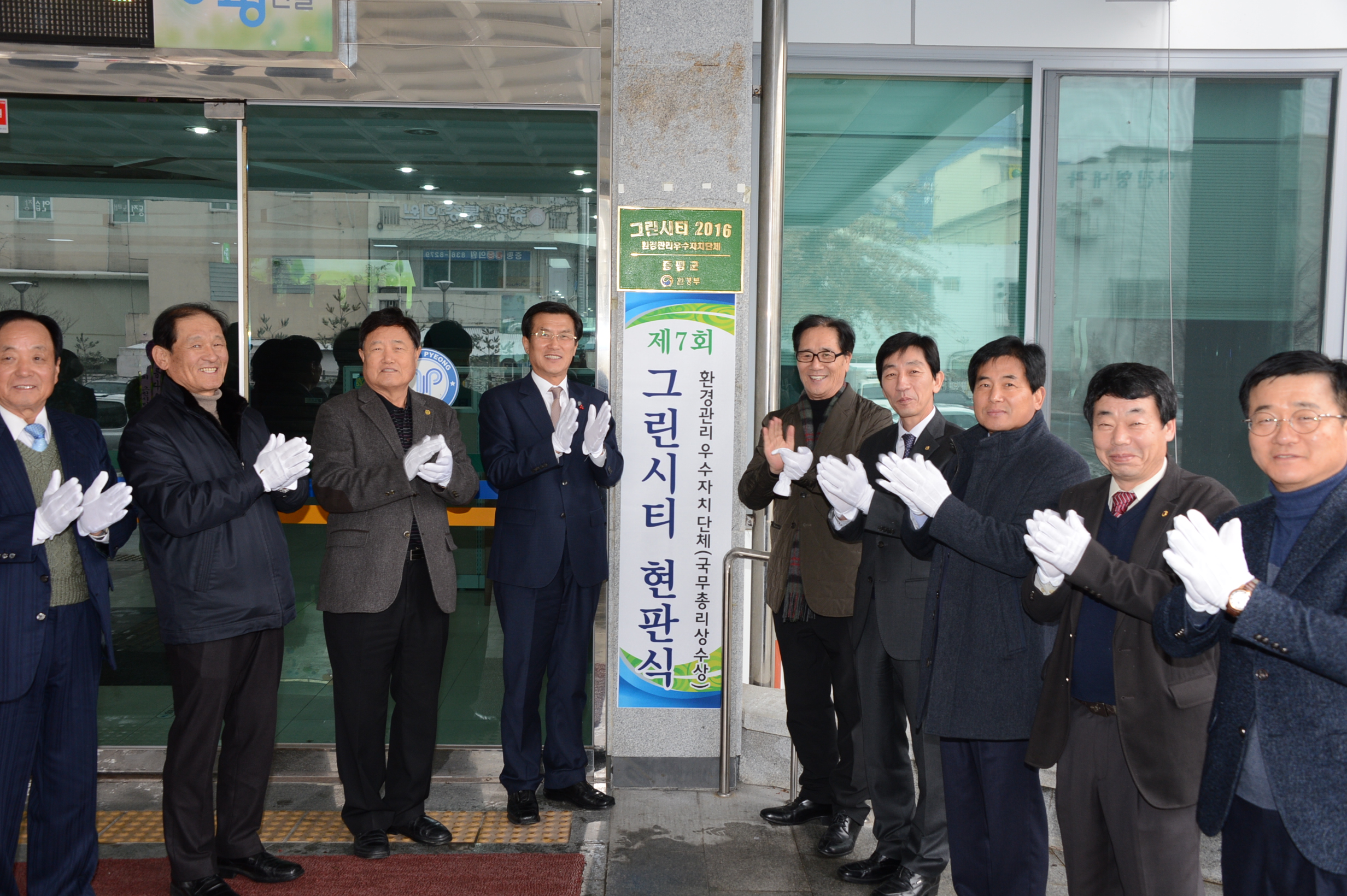 증평군은 23일 군청 현관에서 ‘제7회 그린시티(환경관리우수지자체) 지정 현판식’을 개최했다.(도도자료실 참조)