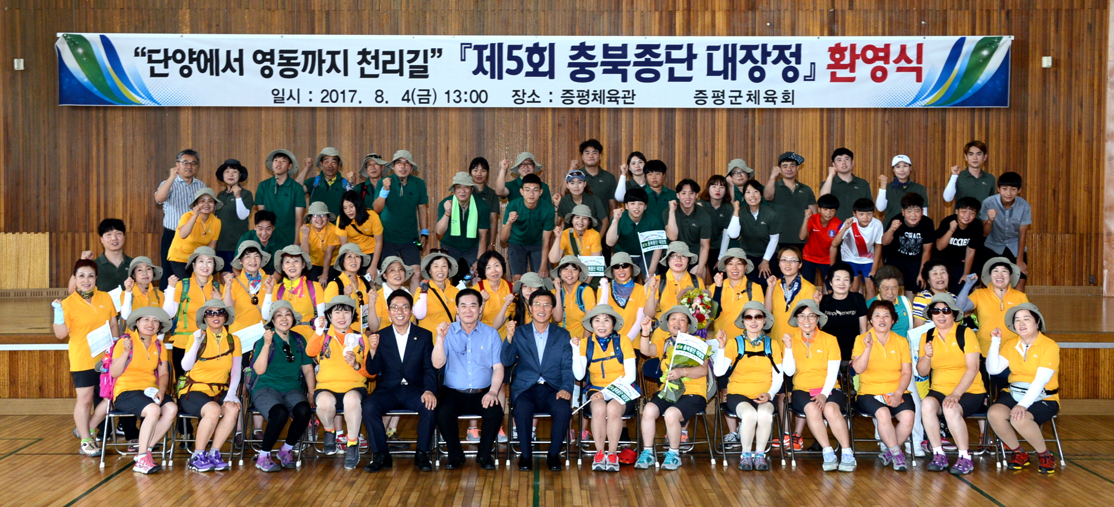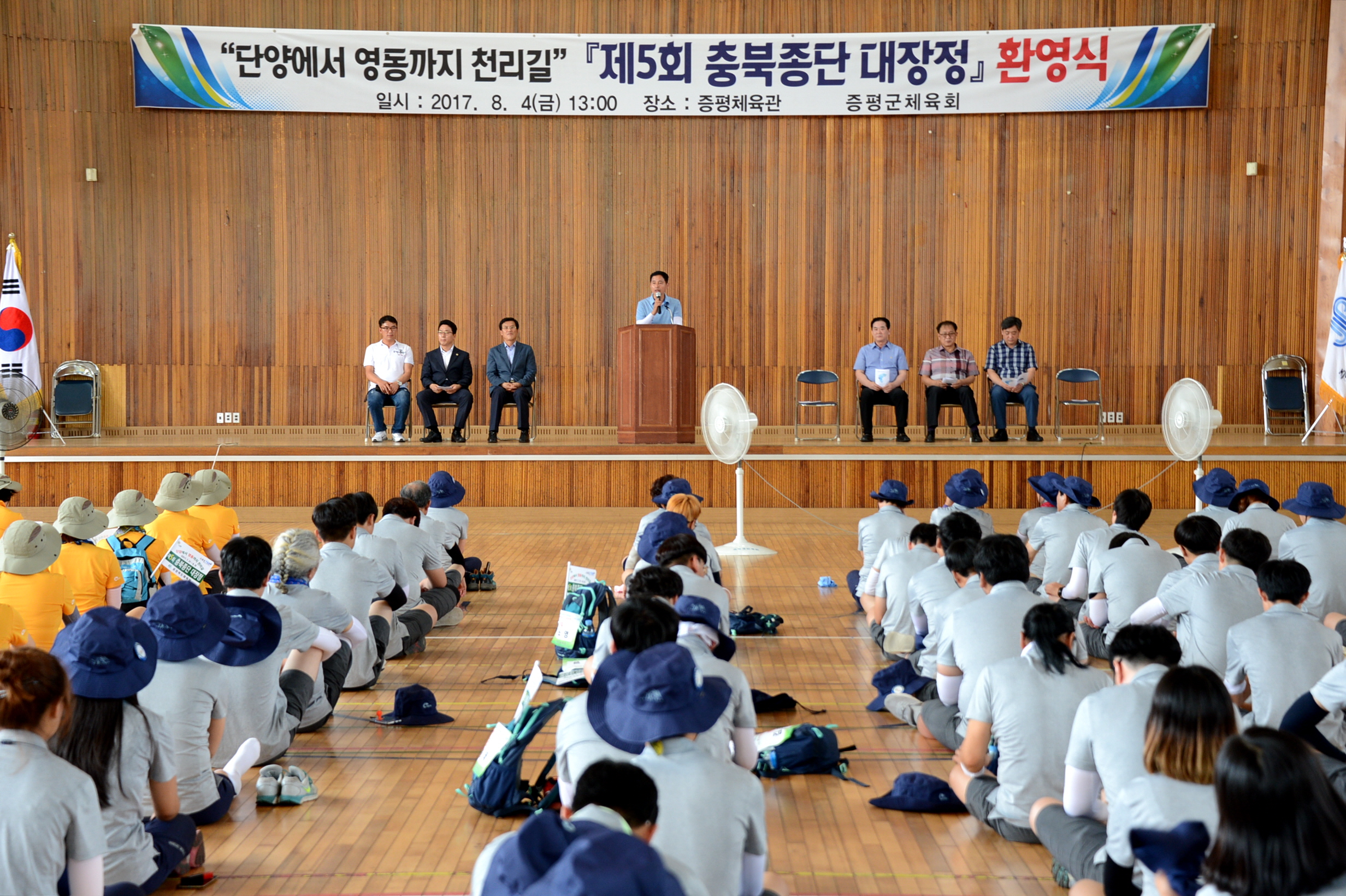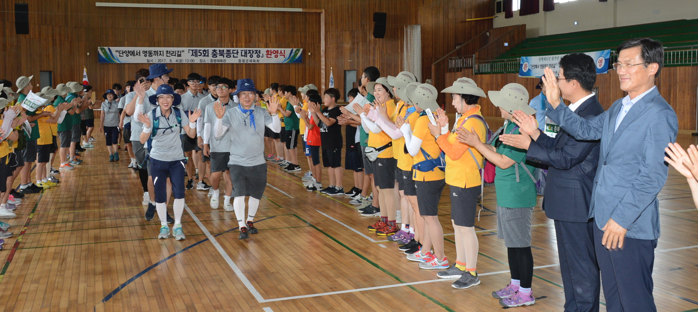 증평군(군수 홍성열)이 4일 증평체육관에서 홍성열 증평군수를 비롯해 김태우 군의회 부의장 등 200명이 참석한 가운데 충북종단 대장정 종주단을 격려하기 위한 환영식을 가졌다.[보도자료실 참조]