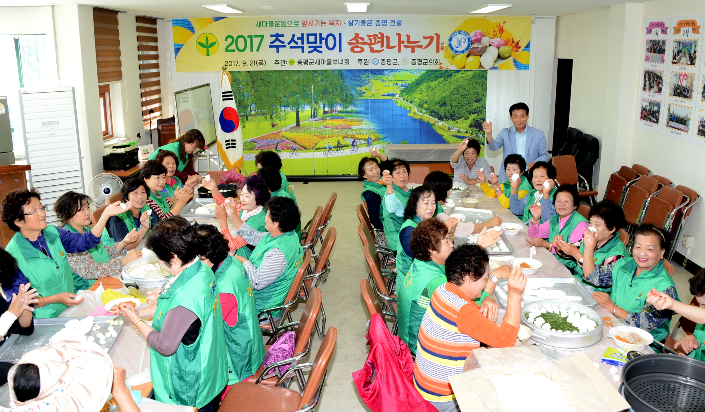 증평군새마을부녀회(회장 최연옥) 부녀회원과 협의회원 80명은 21일 새마을회 2층 회의실에서 ‘사랑의 송편나누기’ 행사를 실시했다.(보도자료실 참조)