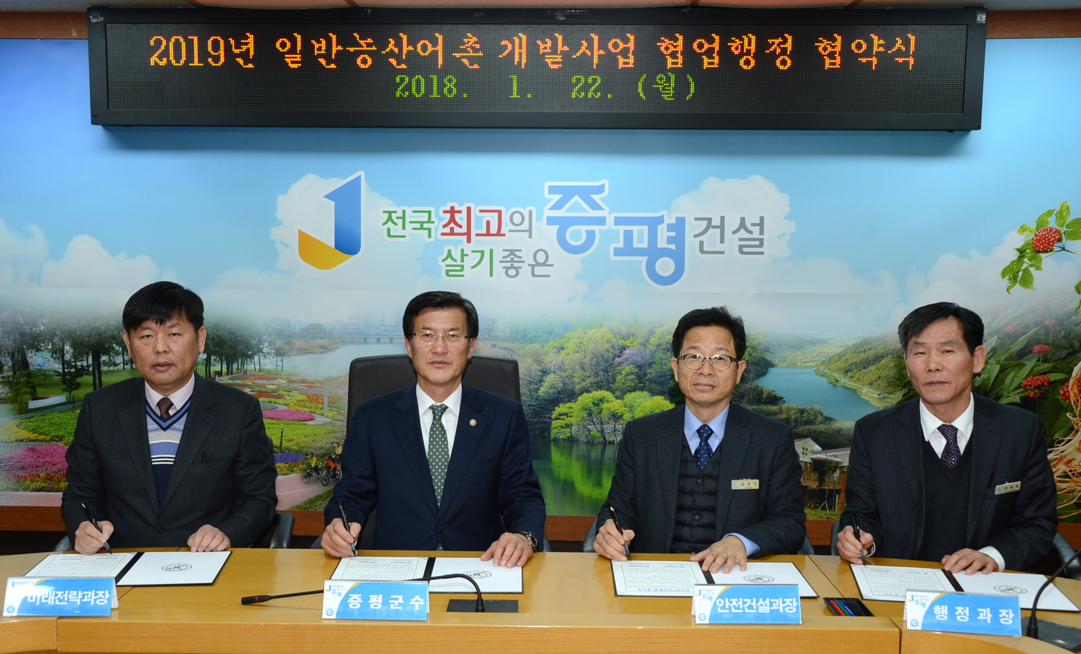 증평군은 22일 소회의실에서 홍성열 군수가 입회한 가운데 농림축산식품부가 공모하는 2019년 일반농산어촌개발사업 응모를 위해 총괄부서와 사업부서가 서로 힘을 모으기로 하고 부서협업행정 협약을 체결했다.(보도자료실 참조)