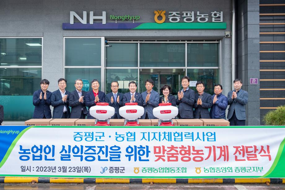 증평군은 23일 증평농협본점(송산리)에서 지역농가의 노동력과 경영비 절감을 위해 지자체 협력사업으로 지원하는‘증평군농협 지자체 협력사업 농기계 전달식’을 가졌다.