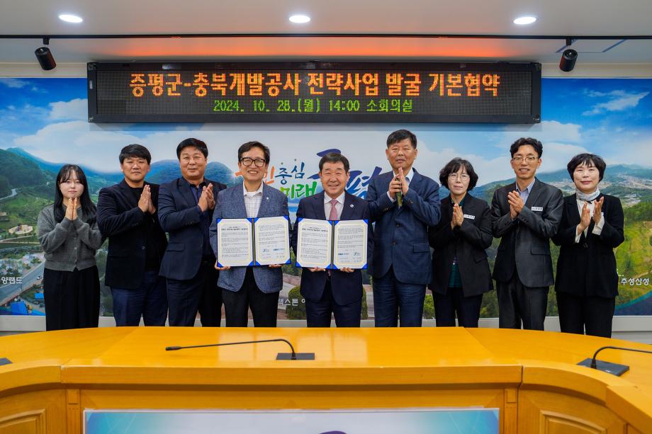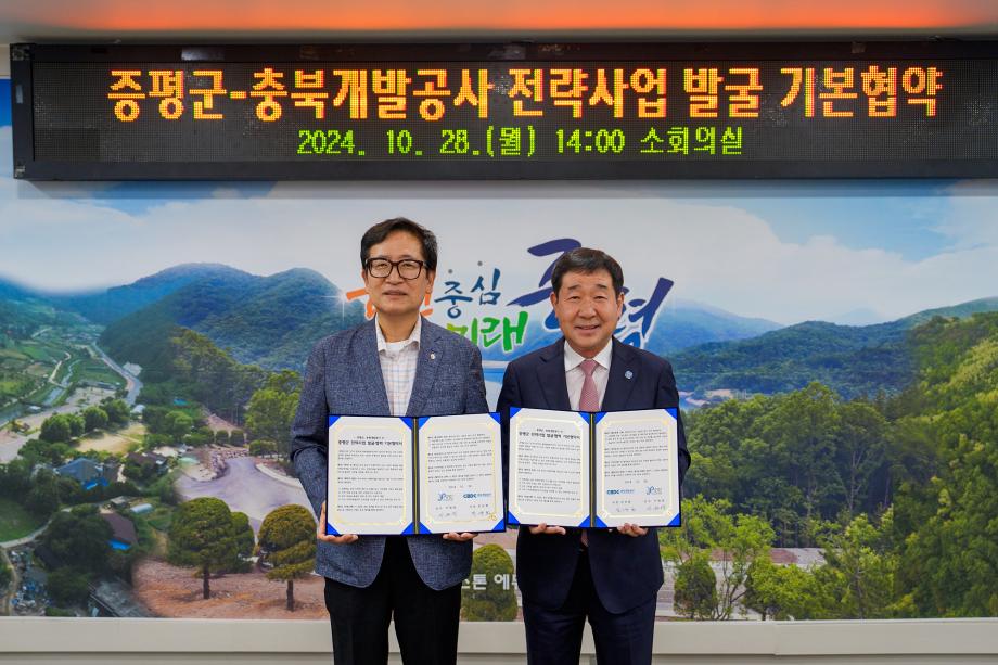 충북 증평군이 충북개발공사(사장 진상화)와 28일 군청 소회의실에서 ‘전략사업 발굴과 협력’을 위한 기본 협약을 체결했다.