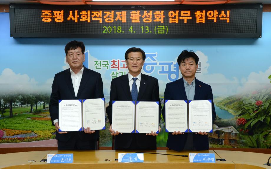 증평군은 13일 군청 소회의실에서 사회적경제 활성화를 위해 고용노동부청주고용노동지청과 SK이노베이션증평공장 간 업무협약을 체결했다.[보도자료실 참조]