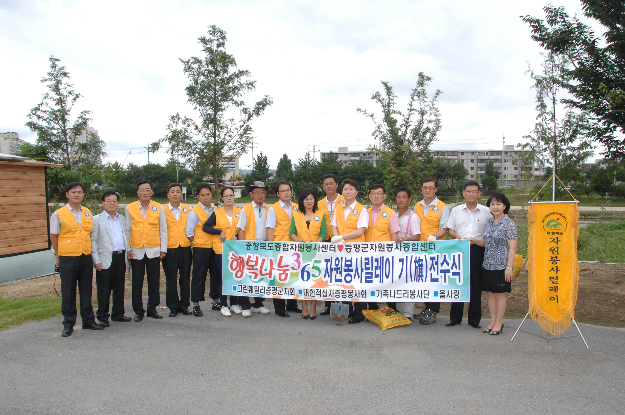 증평군자원봉사센터(센터장 신재영)에서는 7일 오후 2시 증평읍 보강천에서 충북도 릴레이기를 그린훼밀리증평군지회에 전달했다. [증평포커스 참조]