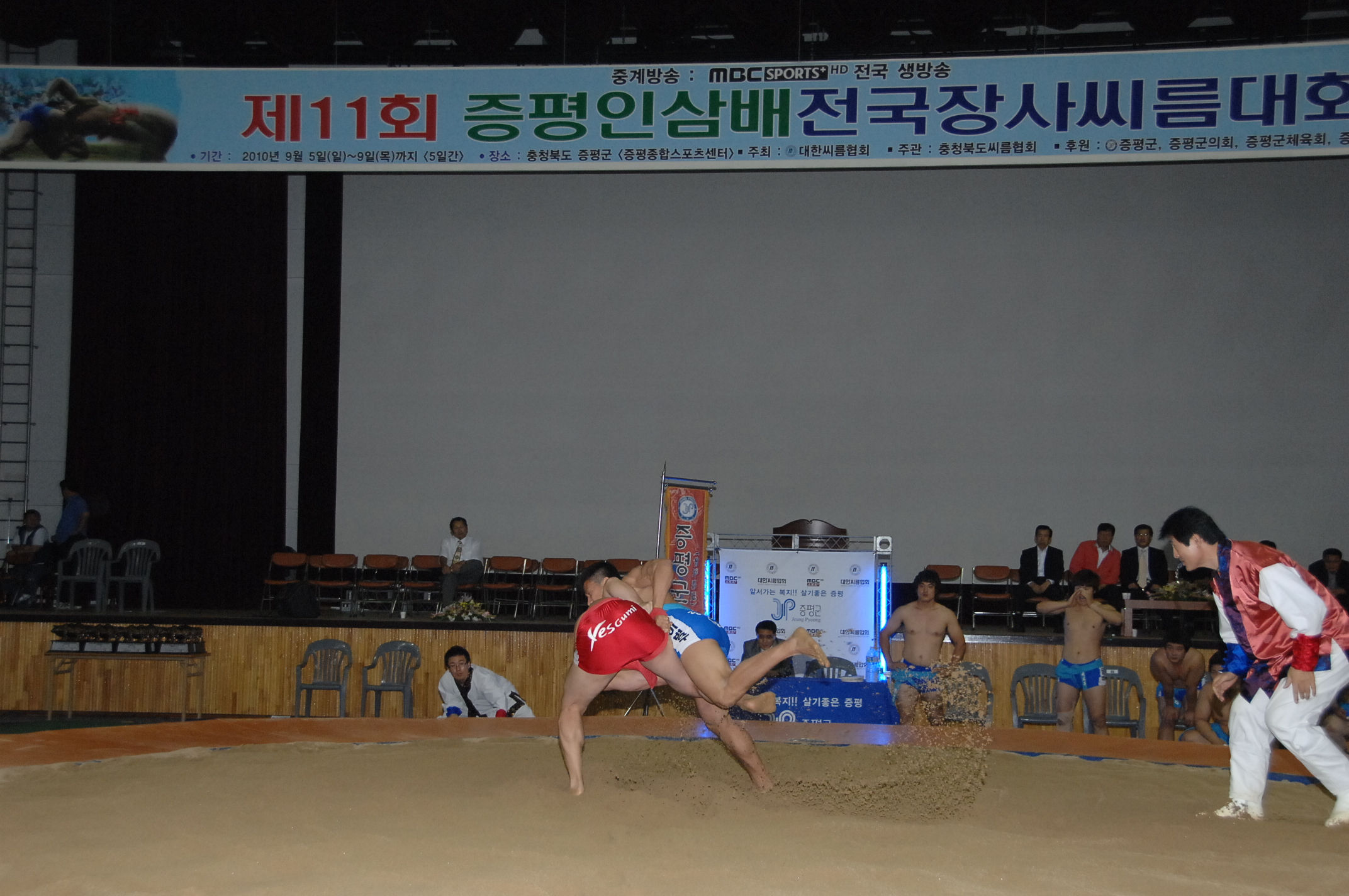 지난 5일 증평스포츠센터에서 개막돼 씨름판을 뜨겁게 달궜던 ‘제11회 증평인삼배 전국장사 씨름대회’가 9일 일반부 단체전 및 통일장사부 결승전 경기를 마지막으로 성황리에 막을 내렸다.[보도자료실 참조]
