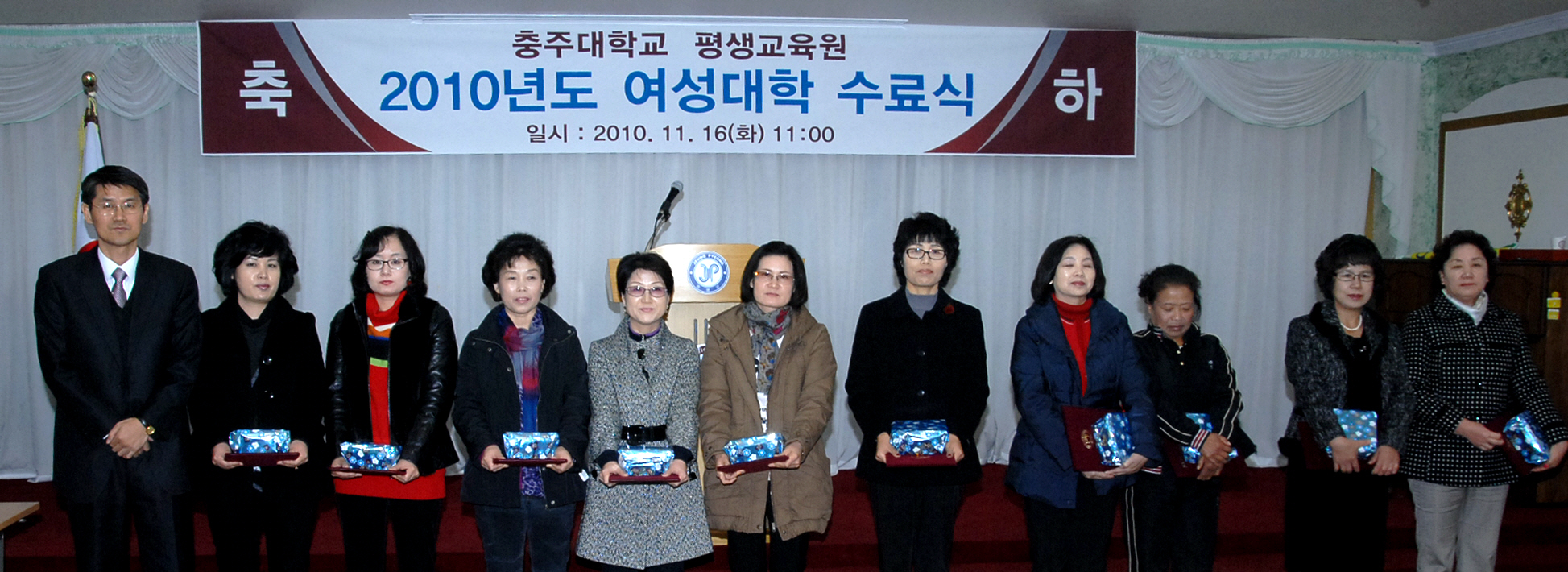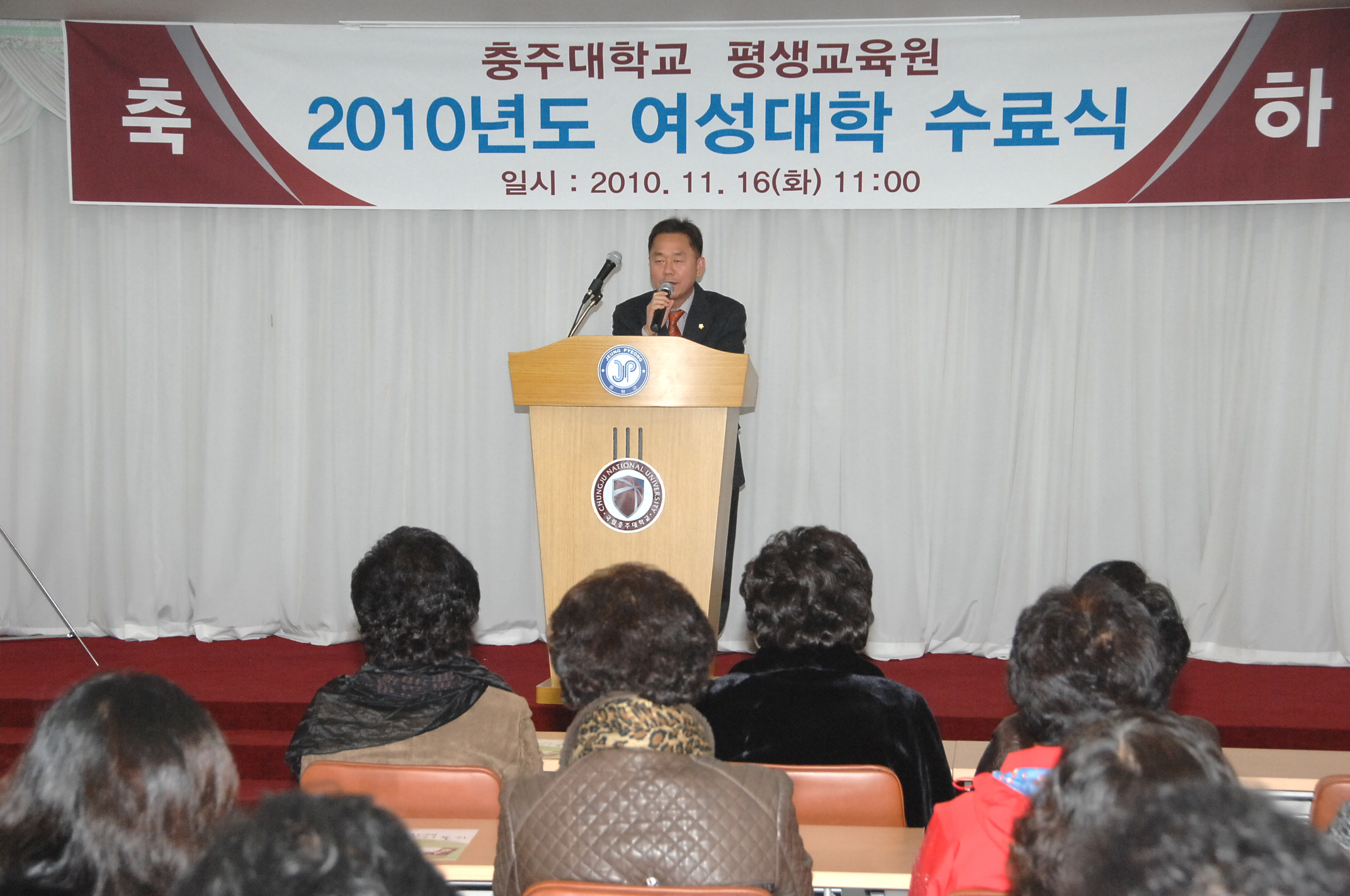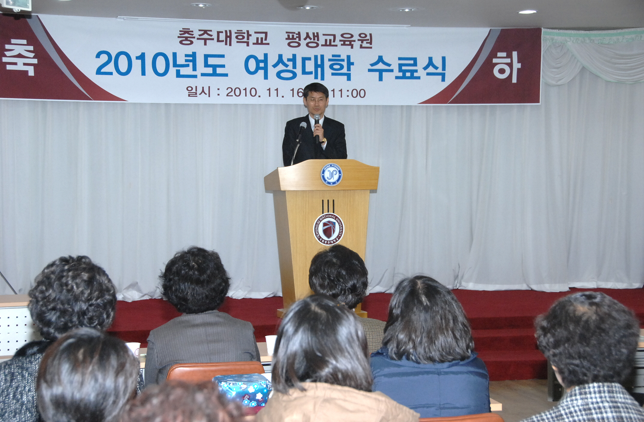 2010년 증평여성대학 종강식이 16일 오전10시 30분 홍성열 증평군수, 김재룡 군의장, 김남순 증평여성단체협의회장, 정기만 충주대학교 평생교육원장을 비롯한 여성주민 등 60여명이 참석한 가운데 증평여성회관 1층 회의실에서 열렸다.[보도자료실 참조]