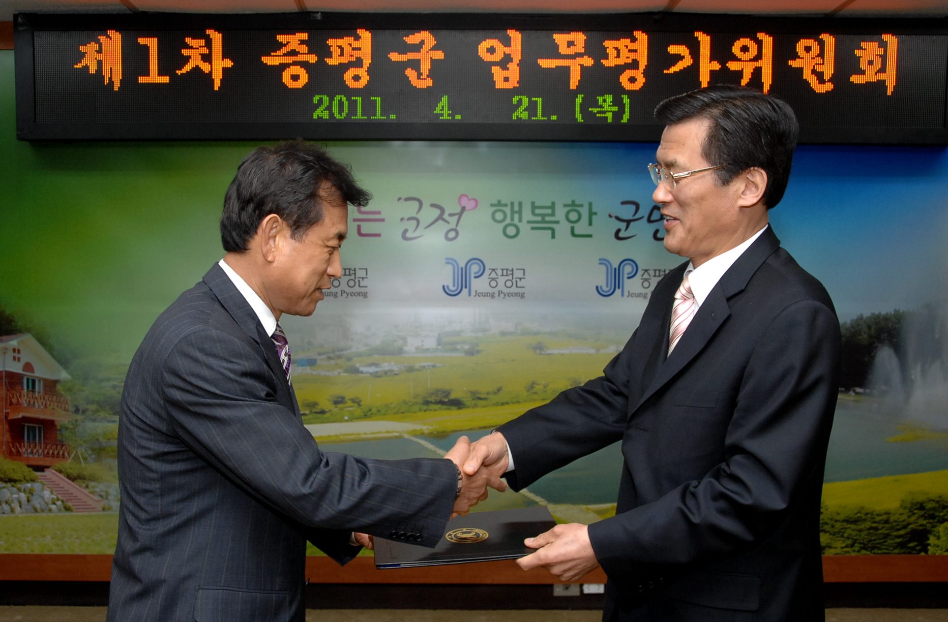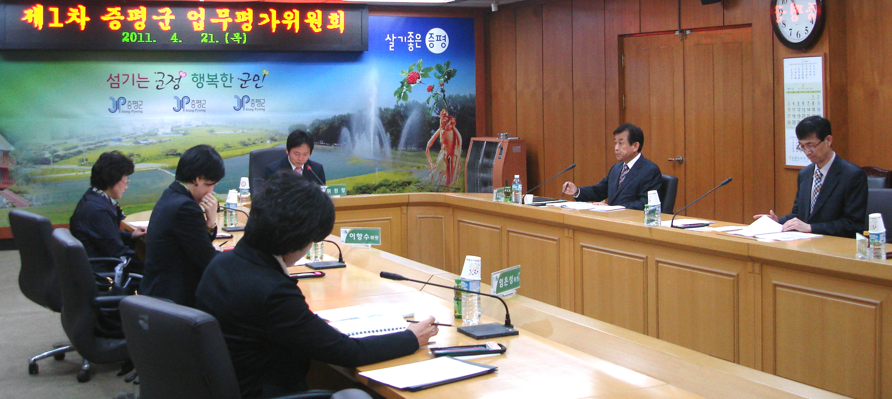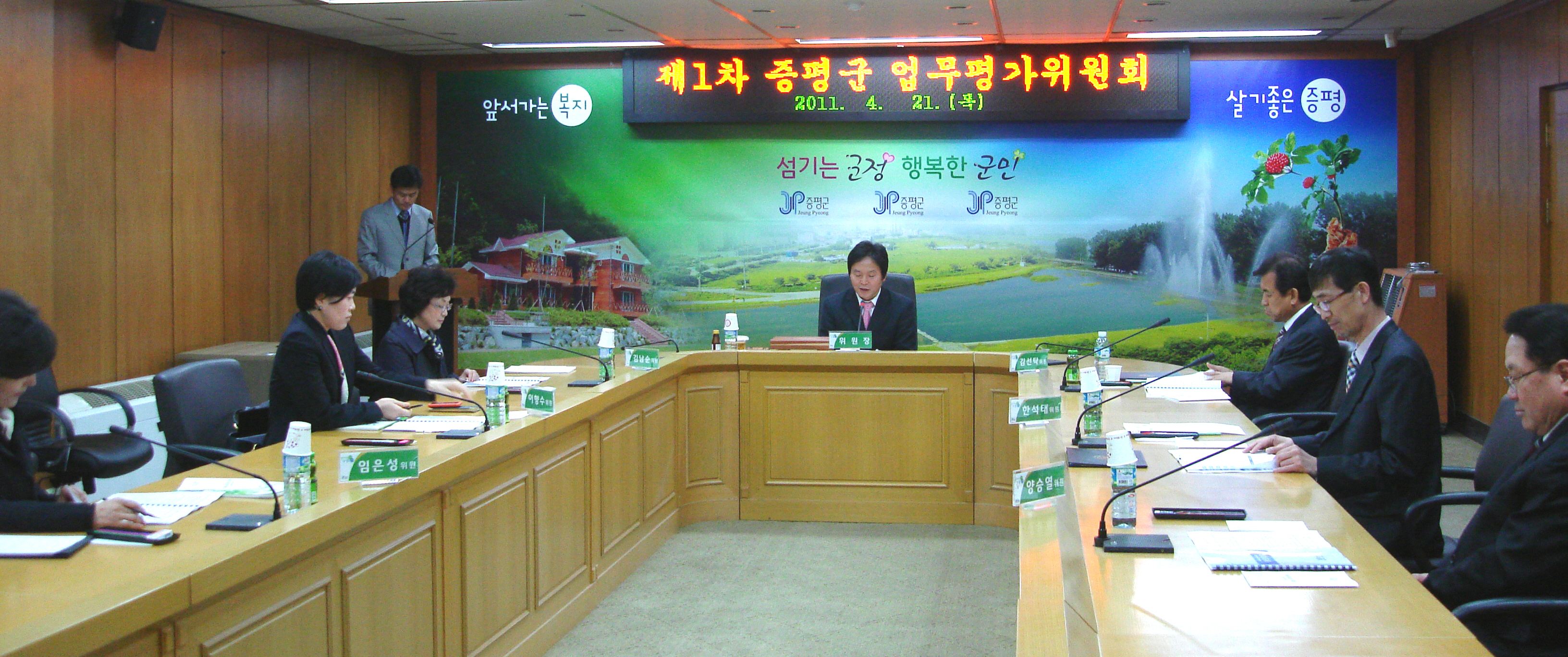 증평군(군수 홍성열)은 21일 오전 11시 군청 소회의실에서 2011년도 군정 주요업무 자체평가 계획의 심의를 위해 제1차 증평군 업무평가위원회를 개최했다. [증평포토포커스 참조]