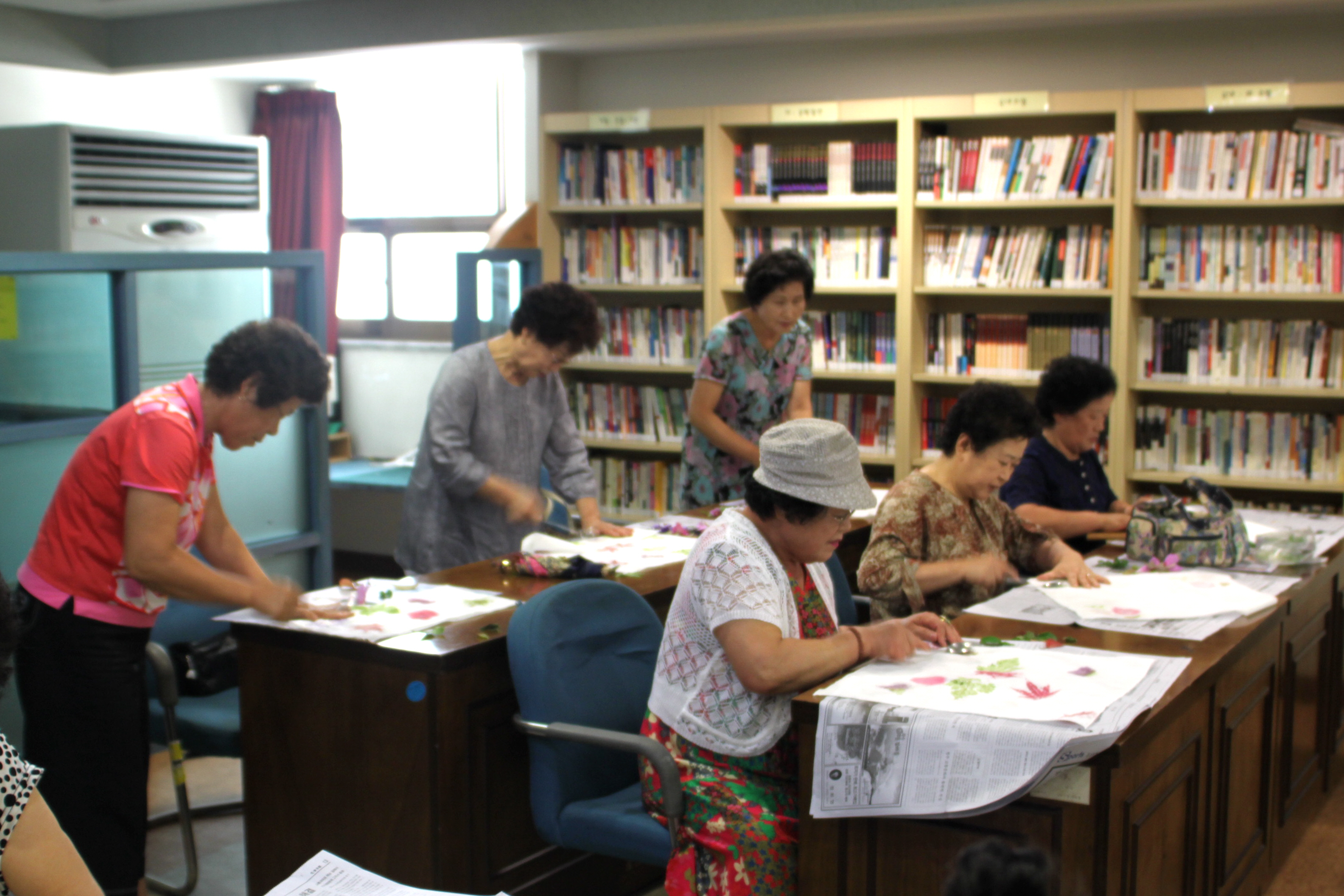증평 문화의 집이 2011 문화의 집 지원사업의 일환으로 ‘야생화를 통한 새대간 만남 장’을 가져 참여한 어르신과 어린이들로 큰 호평을 받고 있다.[보도자료실 참조. 사진은 어르신과 어린이들이 흰 면손수건에 직접 염색한 작품을 들어 보이고 모습과 염색 체험을 하는 모습.]