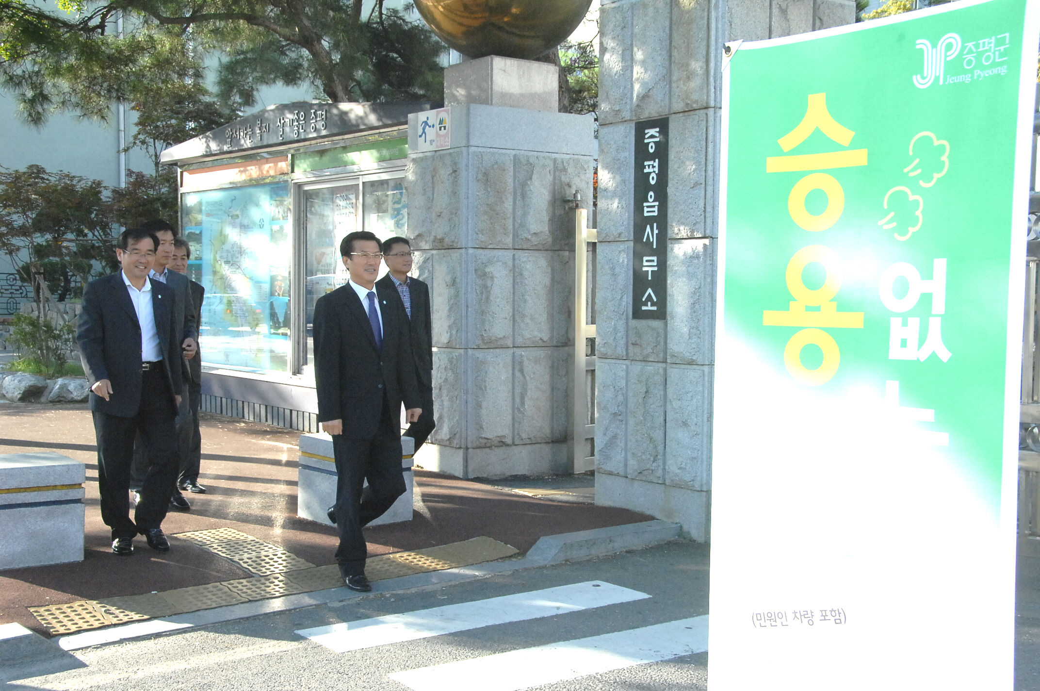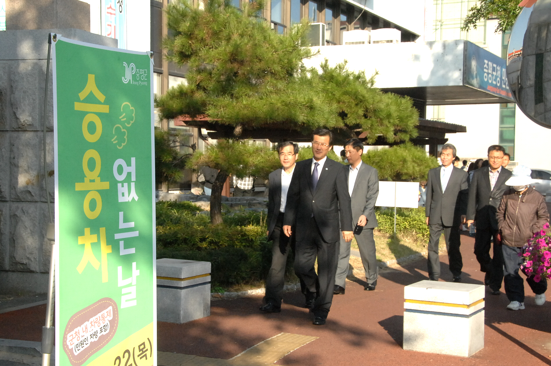 증평군은 22일 "승용차 없는 날"을 맞아 청사 내 주차장에 모든 차량출입을 통제하고 직원들이 대중교통, 자전거 또는 도보로 출근하는 등 대대적인 승용차 이용 자제 운동을 전개했다. [보도자료실 참조: 사진은 홍성열 증평군수가 도보로 출근하는 모습]