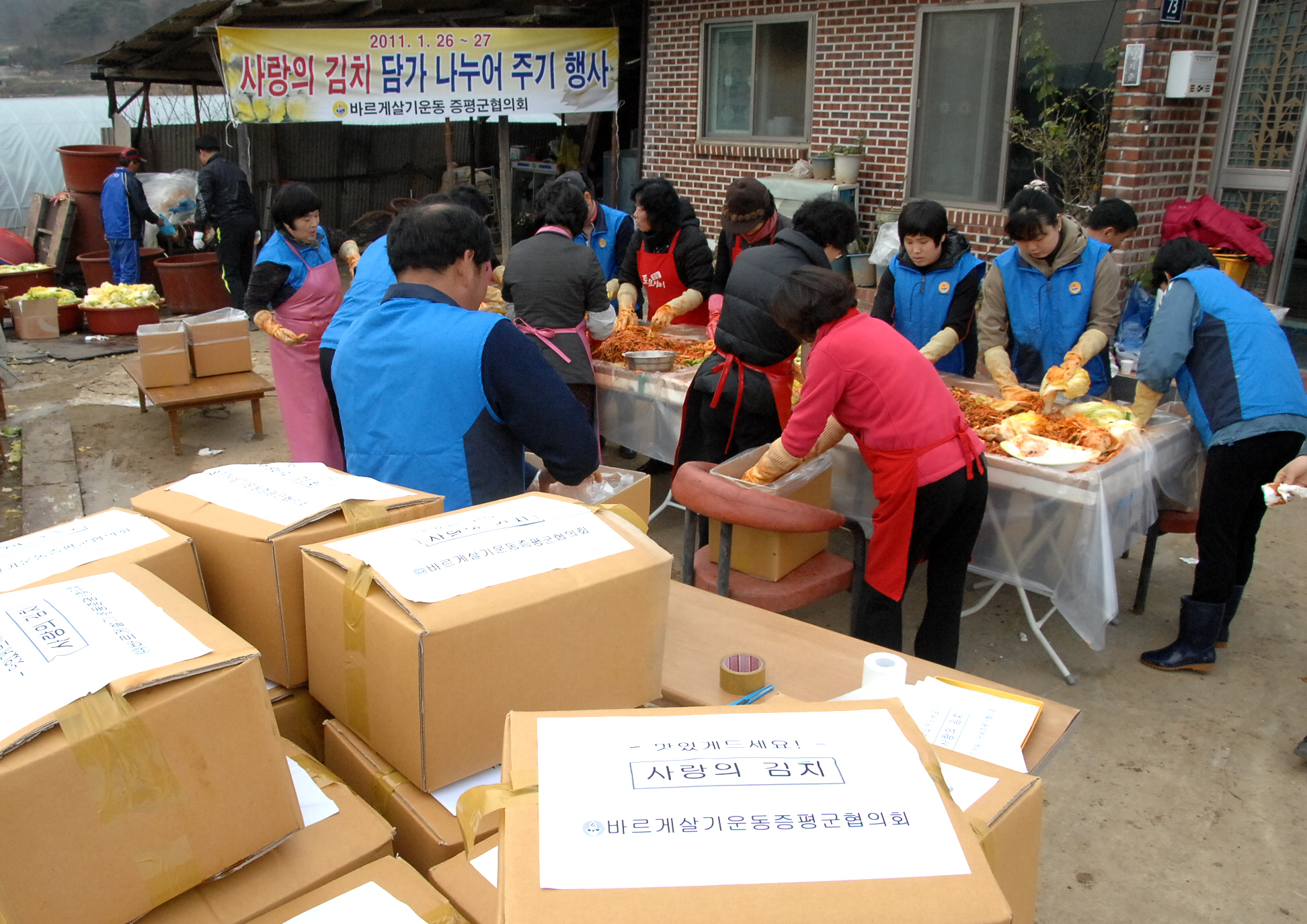 바르게살기운동증평군협의회(이하 바살협, 회장 변종림)은 28일부터 29일까지 도안면 노암 4리에서 지역의 어려운 이웃을 돕기 위한 ‘2011 사랑의 김장나누기’ 행사를 펼쳤다.[보도자료실 참조]