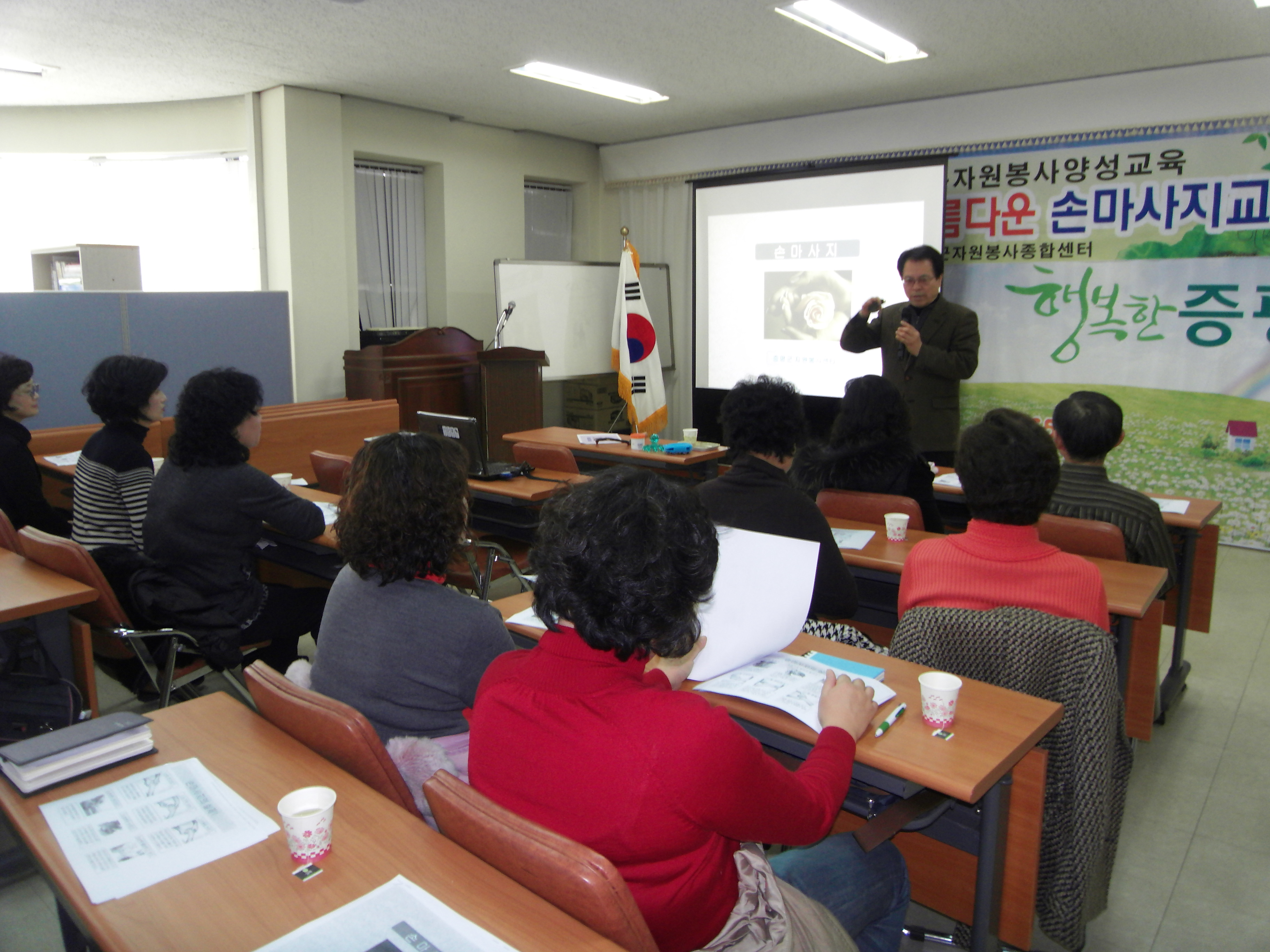 증평군자원봉사종합센터(센터장 신재영)에서는 지난 2월 28일부터 29일까지 자원봉사종합센터 교육장에서 ‘2012 전문자원봉사 손마사지 교육’을 실시했다.[보도자료실 참조]
