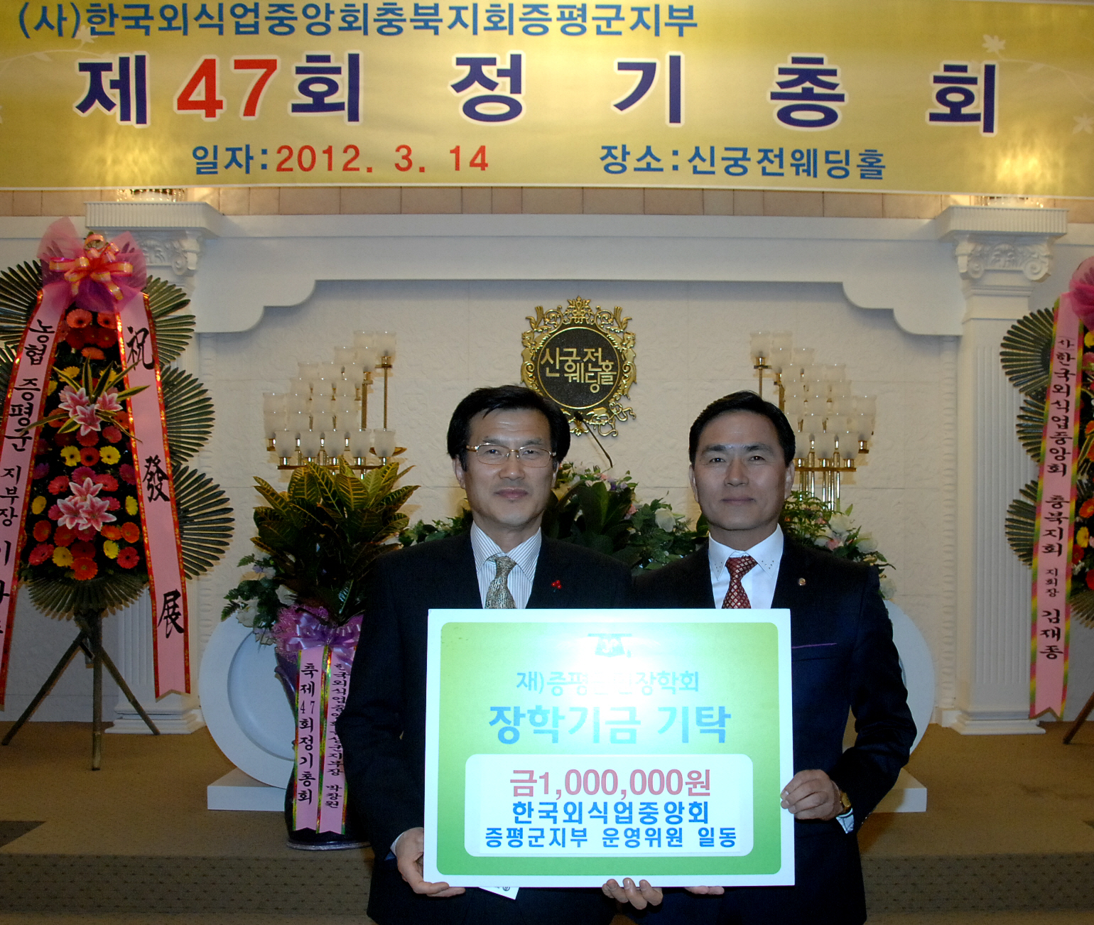 한국외식업중앙회 증평군지부(지부장 지영섭)은 증평지역의 인재 양성을 위해 써달라며 14일 정기총회에서 재단법인 증평군민장학회(이사장 홍성열)에 장학기금 100만원을 기탁했다.[보도자료실 참조]