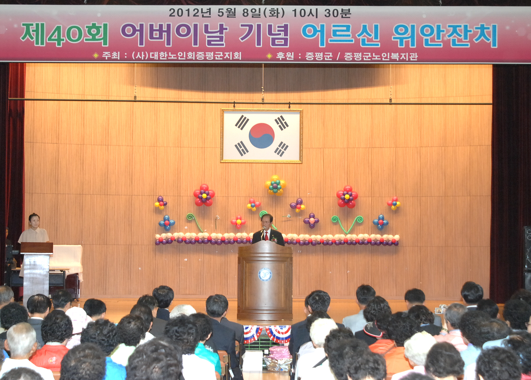 (사)대한노인회증평군지회(회장 김재성)가 주관하고 증평노인복지관(관장 이흥식)이 후원하는 제40회 어버이날 기념행사가 8일 오전 10시 30분 증평청소년수련관강당에서 각급 기관단체장, 어르신 및 가족 등 600여명이 참여한 가운데 열렸다.[보도자료실 참조]