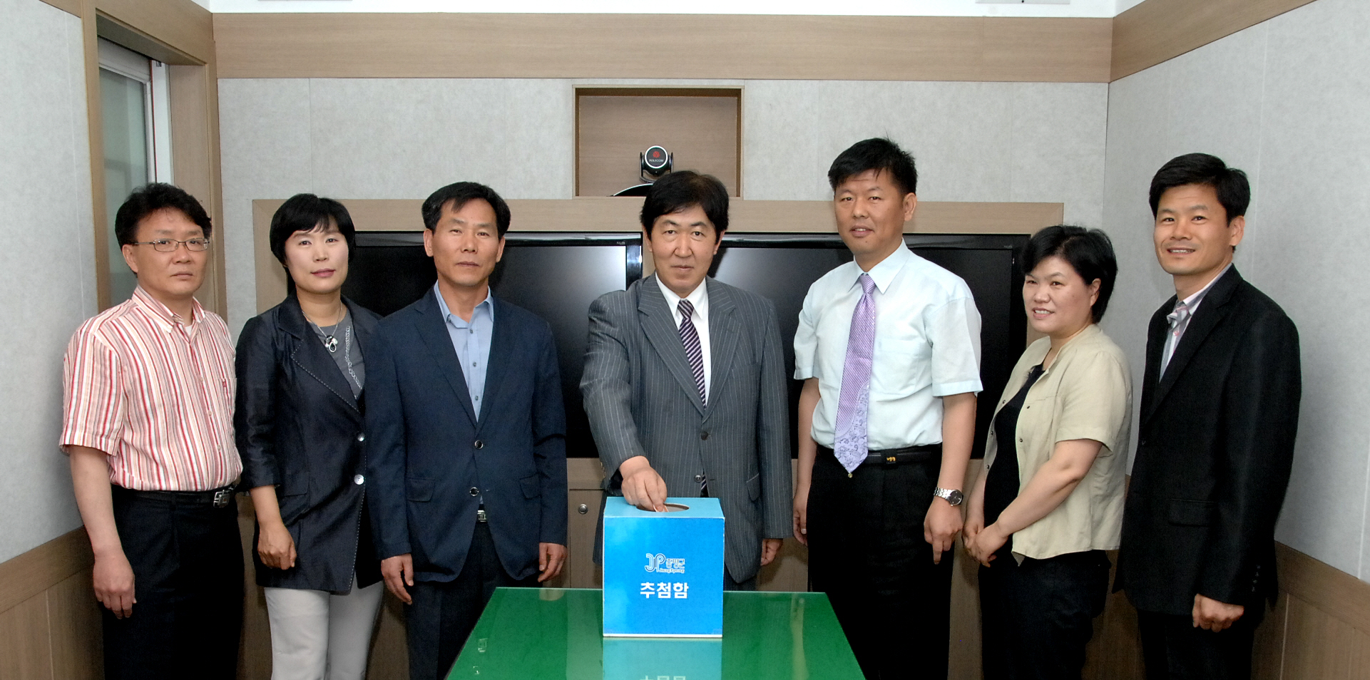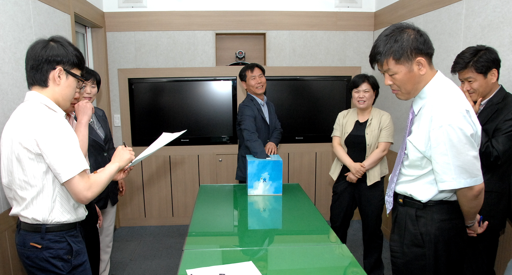 증평군은 증평사랑으뜸 상품권 유통활성화를 위한 경품추첨 행사를 군 감사법무담당이 입회한 가운데 22일 오전 10시 경제과 영상회의실에서 실시했다 .사진 1은 연규봉 기획감사실장이 1등 당첨자를 추첨하자 함께 참석한 직원들이 축하의 박수를 치고 있는 모습이다.[보도자료실 참조]