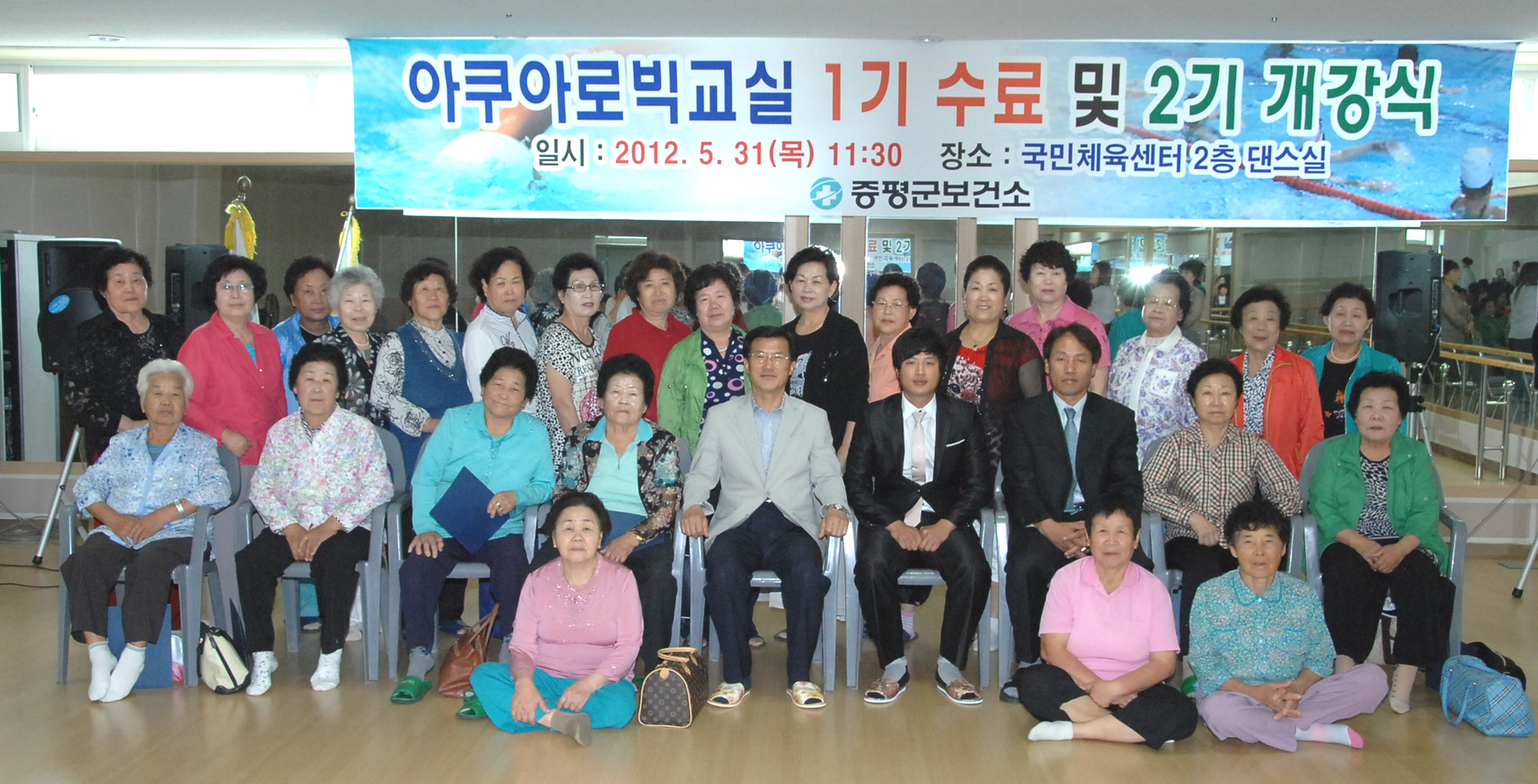 증평군보건소는 31일 오전 11시 증평국민체육센터 2층 댄스실에서 수강자 등 관계자 80여명이 참석한 가운데 1기 아쿠아로빅 수영교실 수료식 및 제2기 개강식을 실시했다.[보도자료실 참조]