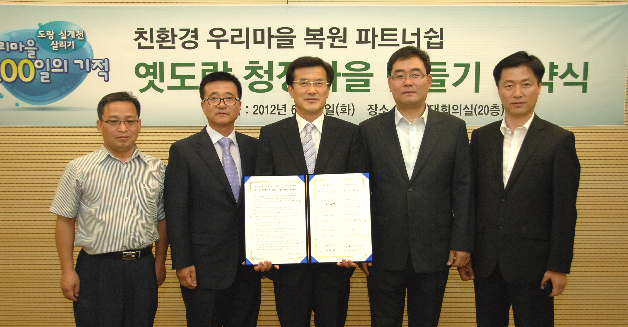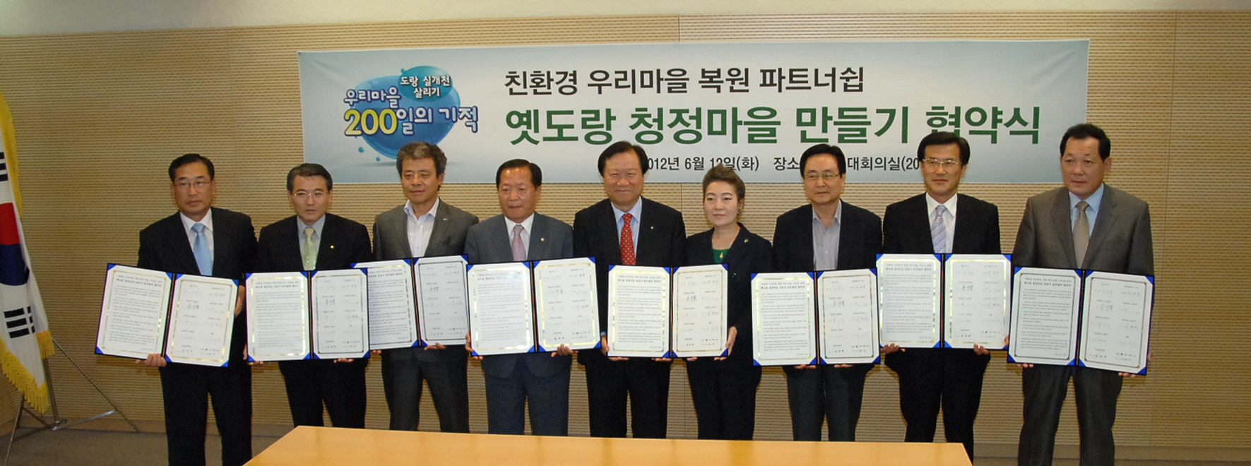 12일 SBS 서울 목동사옥 대회의실에서는 환경부, SBS, 농협중앙회, 증평군 등이 참여한 가운데 옛 도랑 청정마을 만들기 협약식이 열렸다.[사진 맨위는 왼쪽부터 우원길 SBS사장, 홍성열군수, 유영숙 환경부장관.보도자료실 참조]