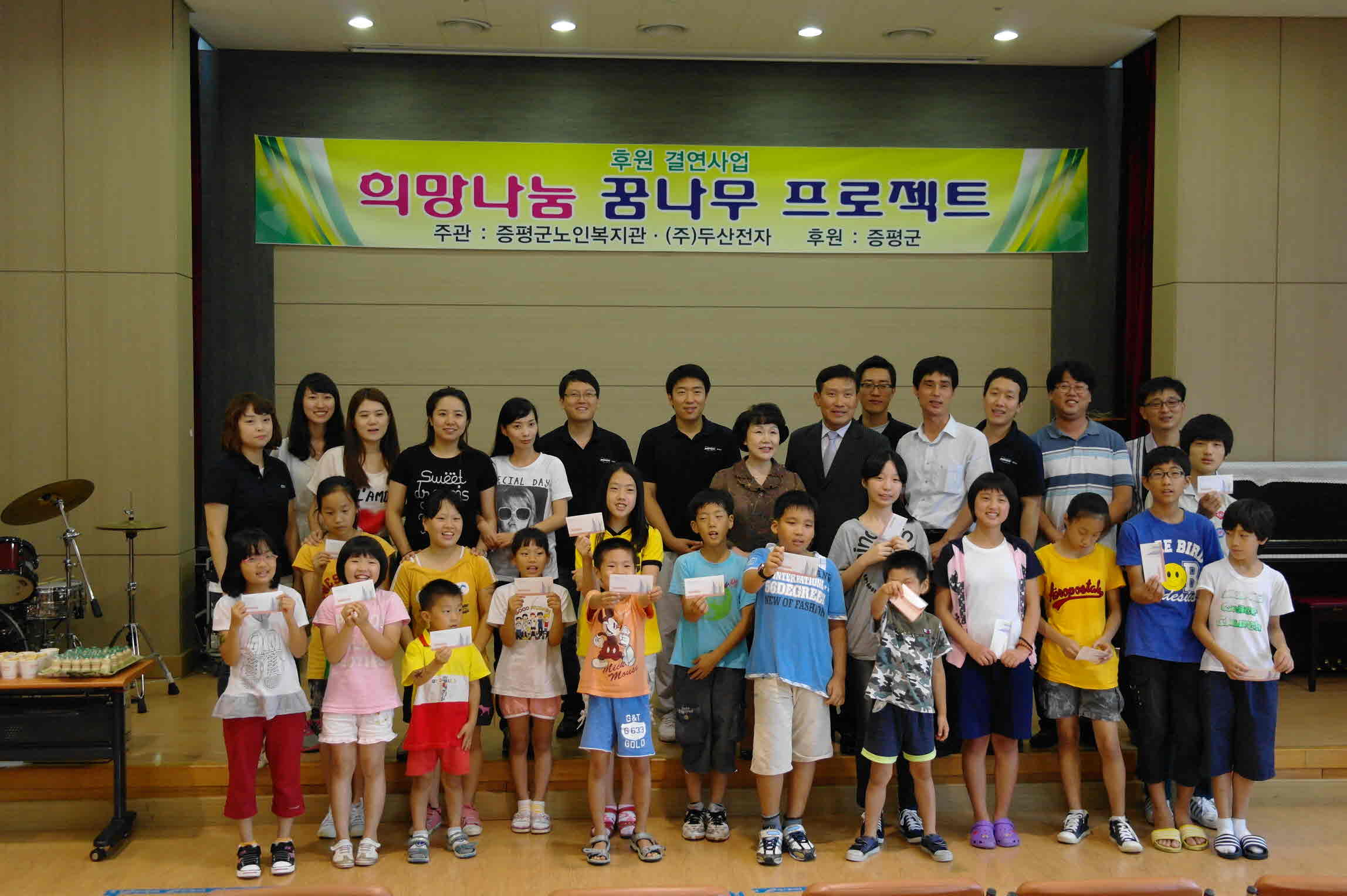 증평군에 입주해 있는 두산전자가 지역 내 형편이 어려운 학생들을 위해 실시하고 있는 ‘희망나눔 꿈나무 프로젝트’가 눈길을 끌고 있다.[보도자료실 참조]