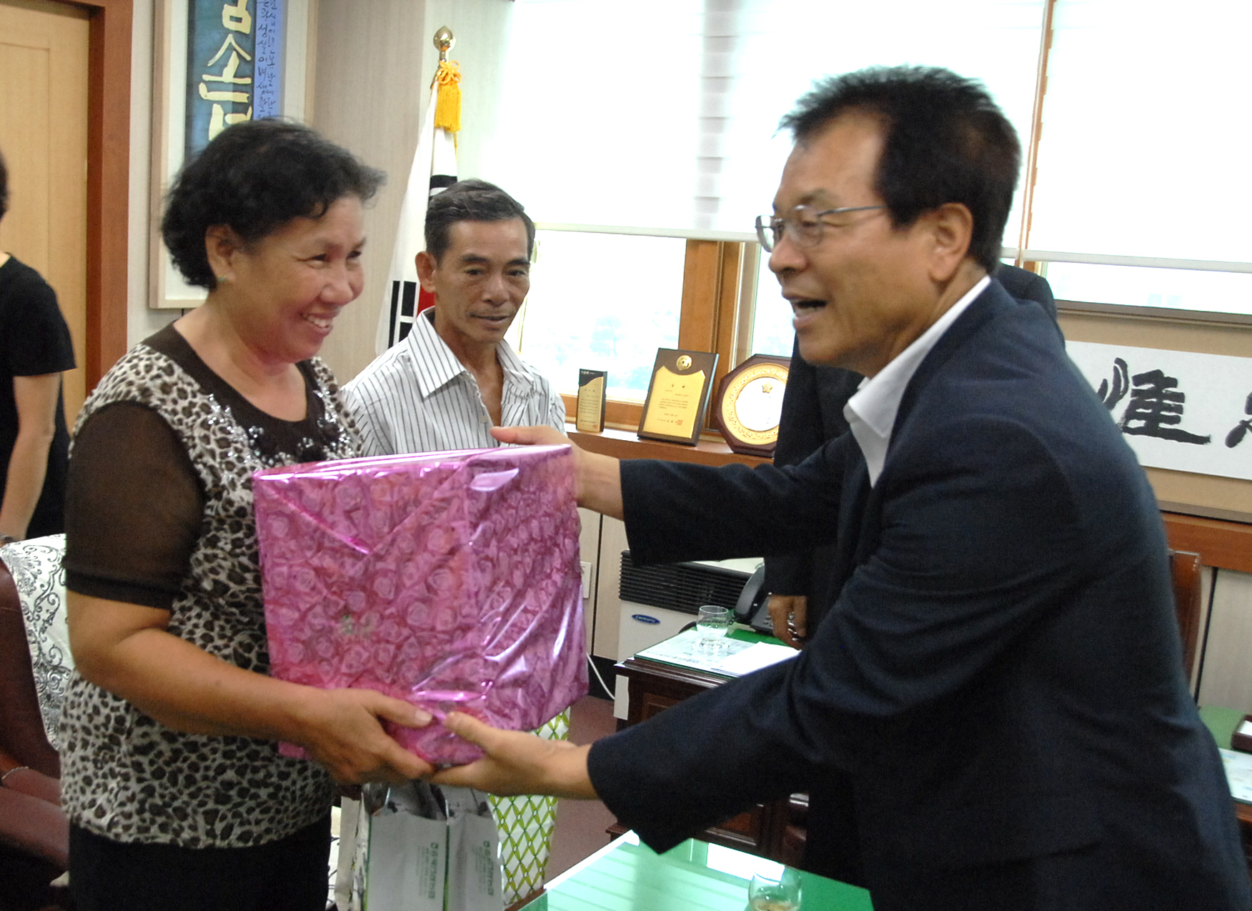 증평군에 거주하고 있는 두엉티깜(24세)씨는 고국인 베트남에서 친정부모를 초청한 가운데 남편 김대경(42세)씨와 바르게살기운동증평군협의회 임원 등 10여명과 함께 27일 오전 10시 군청을 방문해 홍성열 증평군수와 환담을 나눴다. [보도자료실 참조]