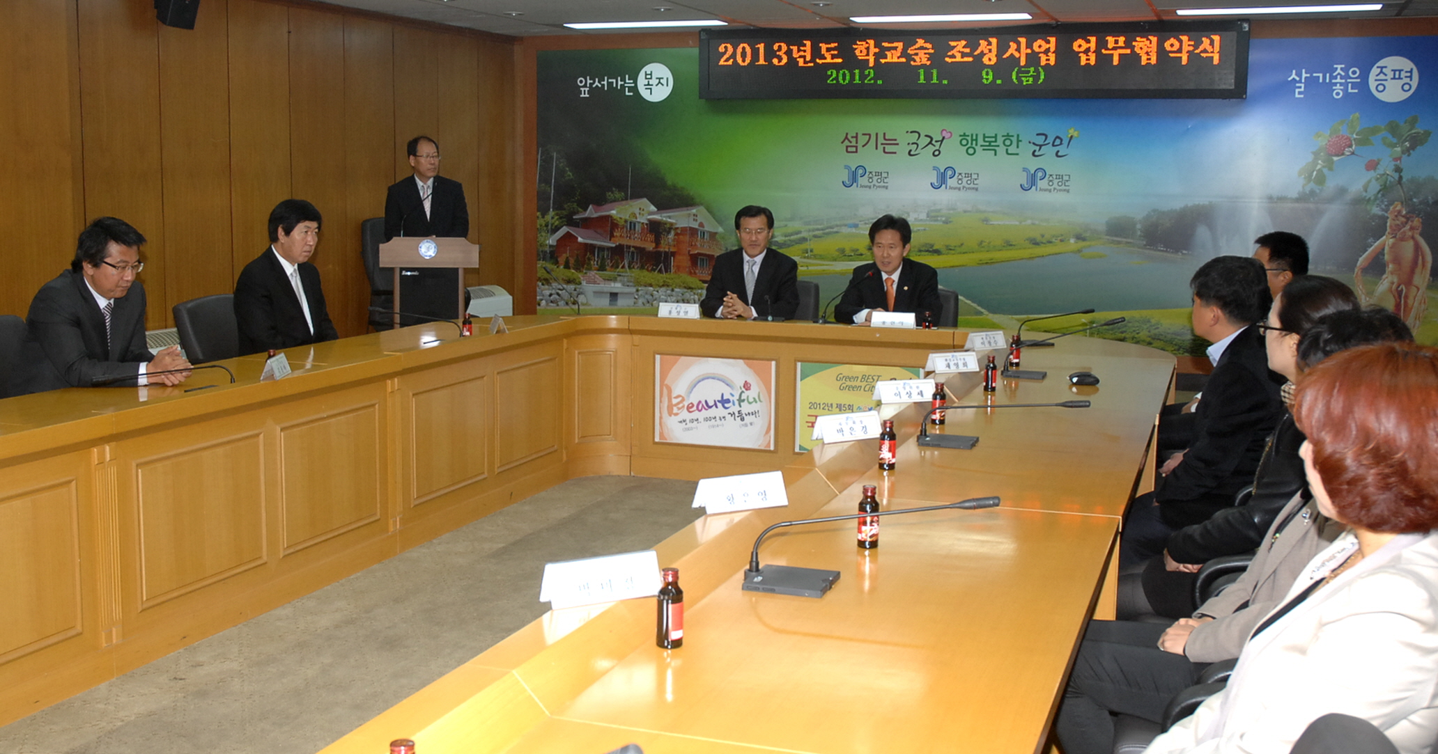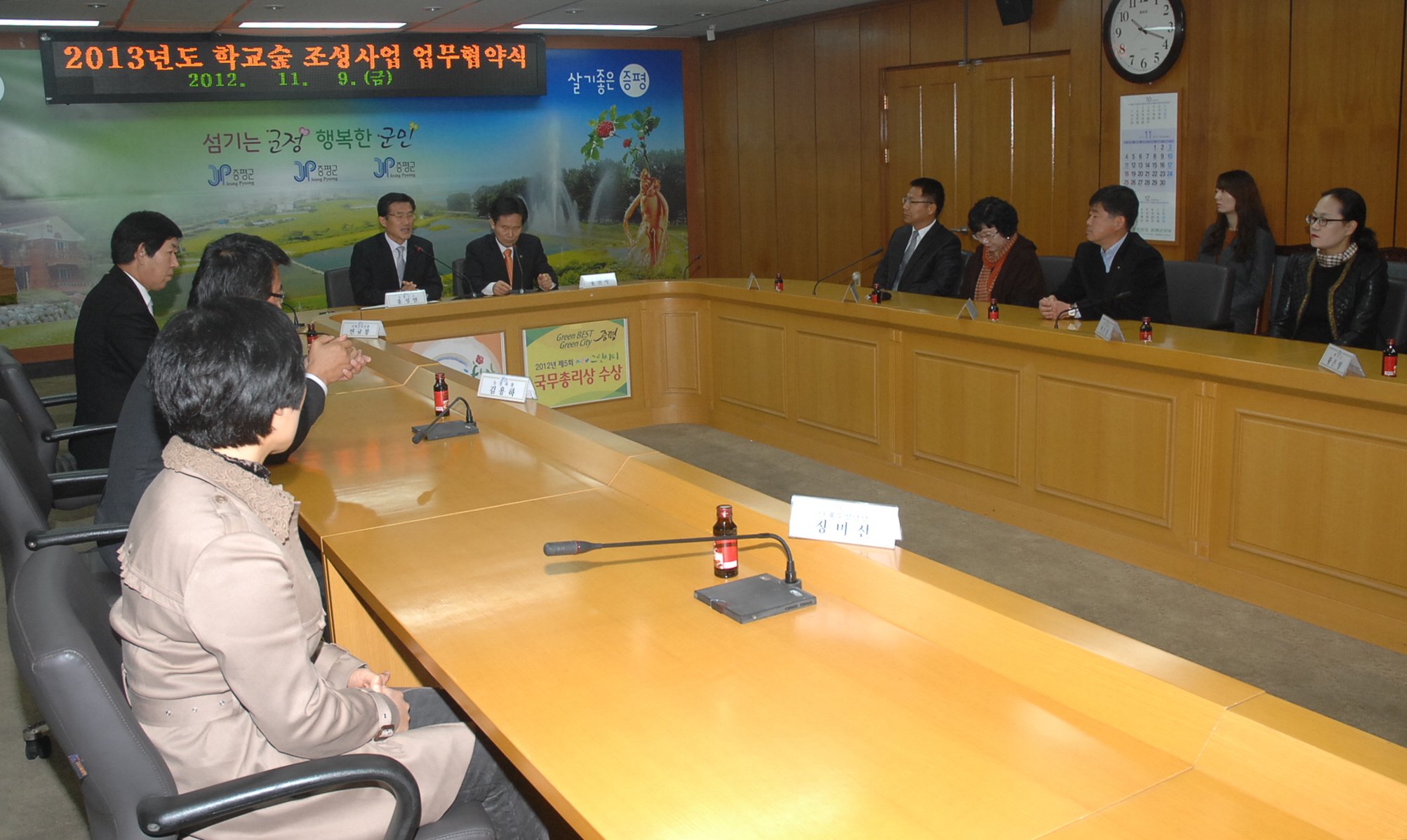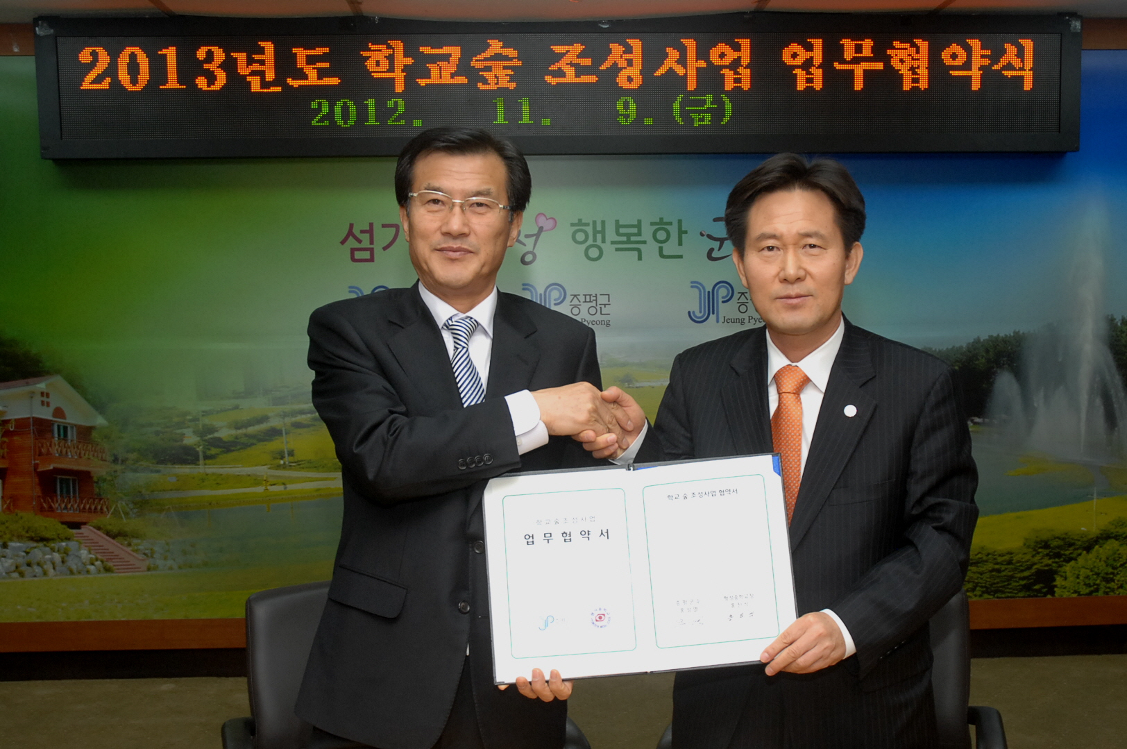 증평군(군수 홍성열)은 9일 오전 10시 군청소회의실에서 형석중학교(교장 홍진식)와 업무협약을 체결하고 내년부터 총사업비 6천만원을 투입해 형석중학교 부지 내 학교숲 조성사업을 추진하기로 했다. [보도자료실 참조]