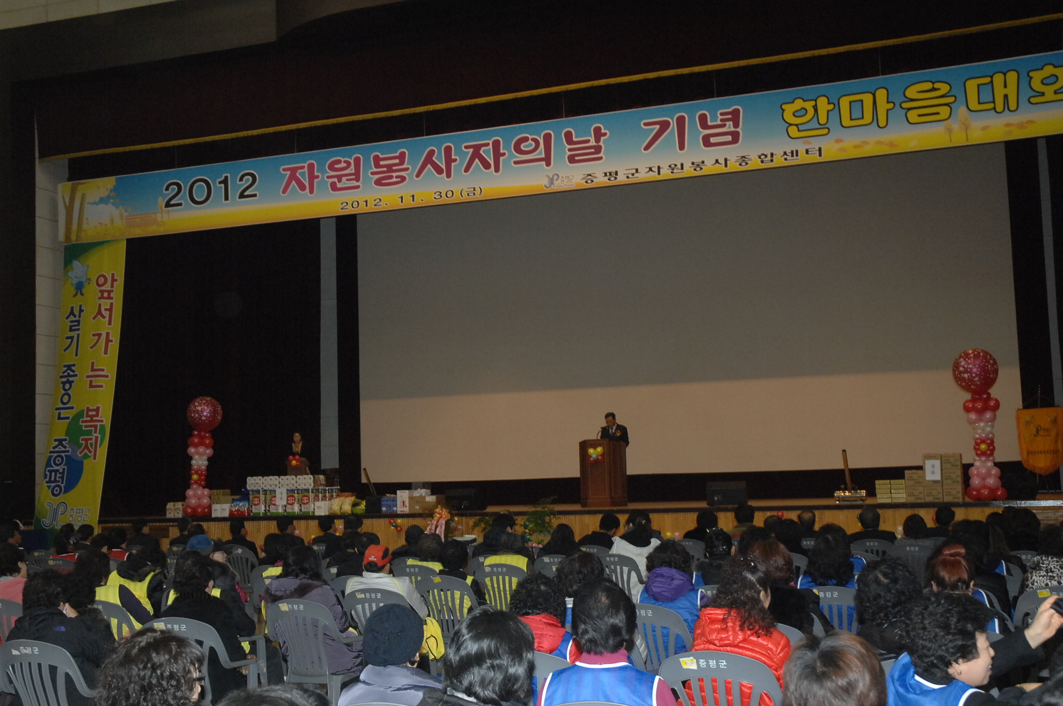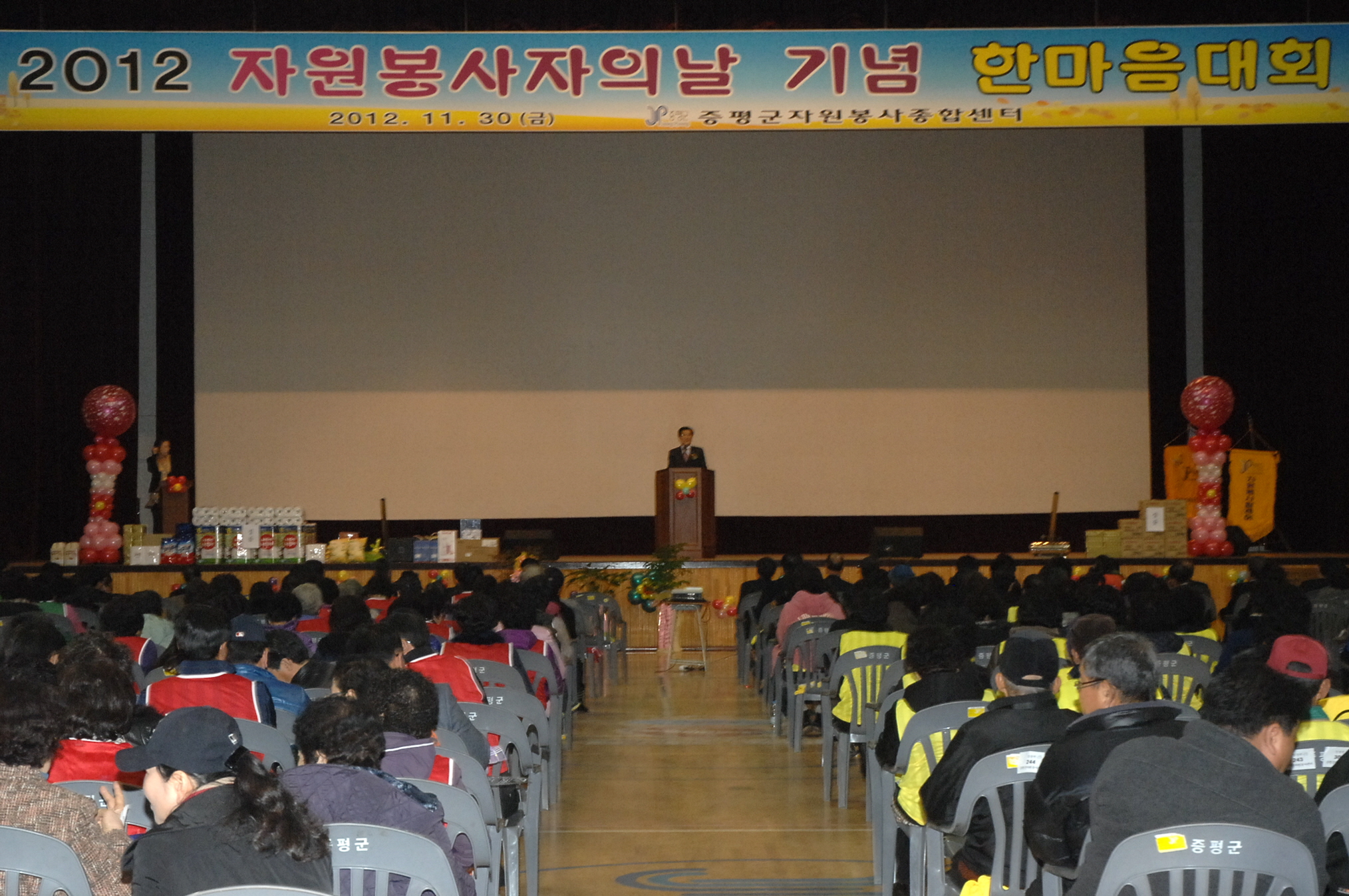 증평군자원봉사종합센터(센터장 신재영)는 30일 오후 1시 30분부터 증평종합스포츠센터에서 자원봉사자 500여명이 참석한 가운데 ‘2012 자원봉사자의 날 기념 한마음대회’를 개최했다. [보도자료실 참조]
