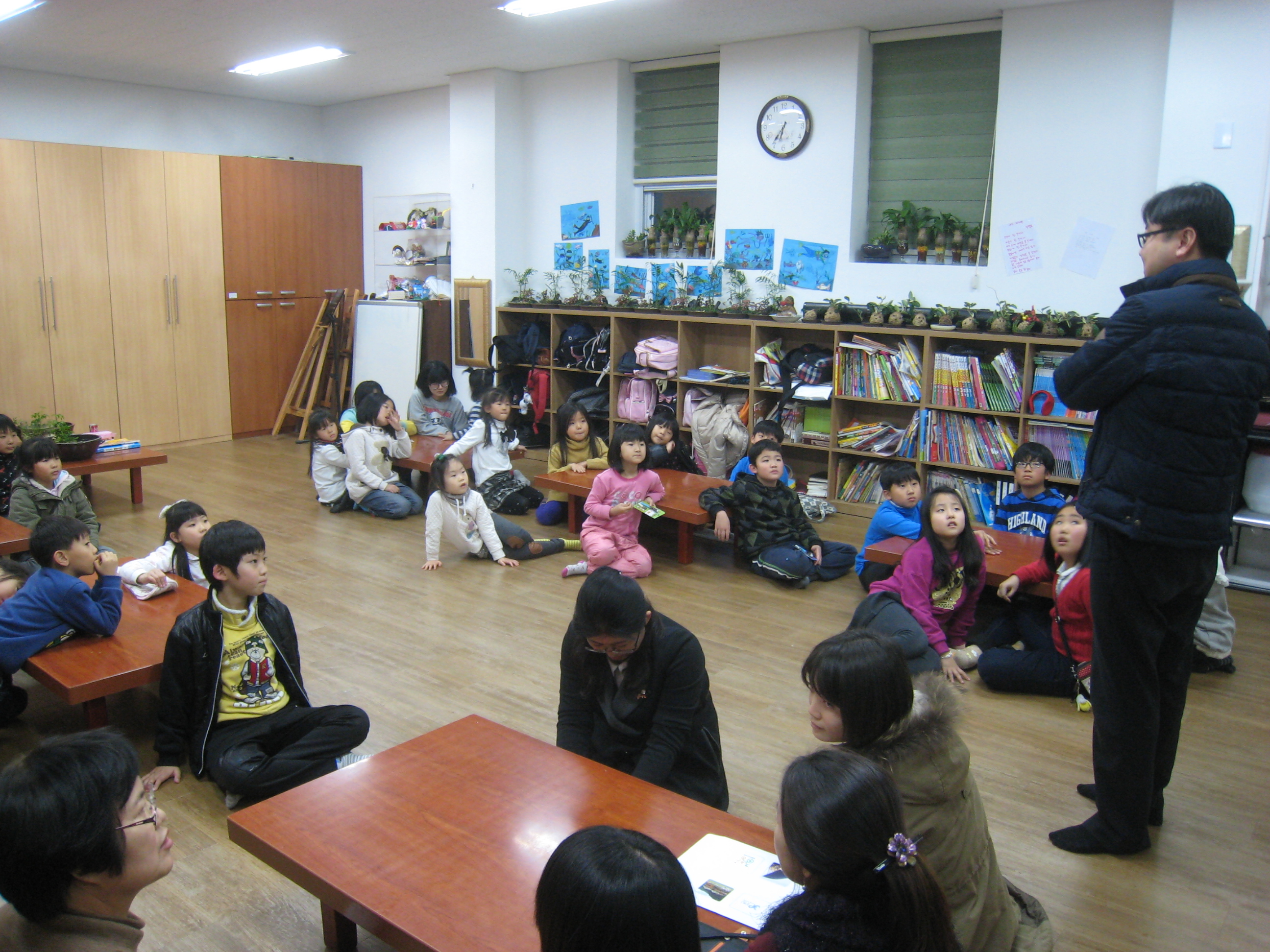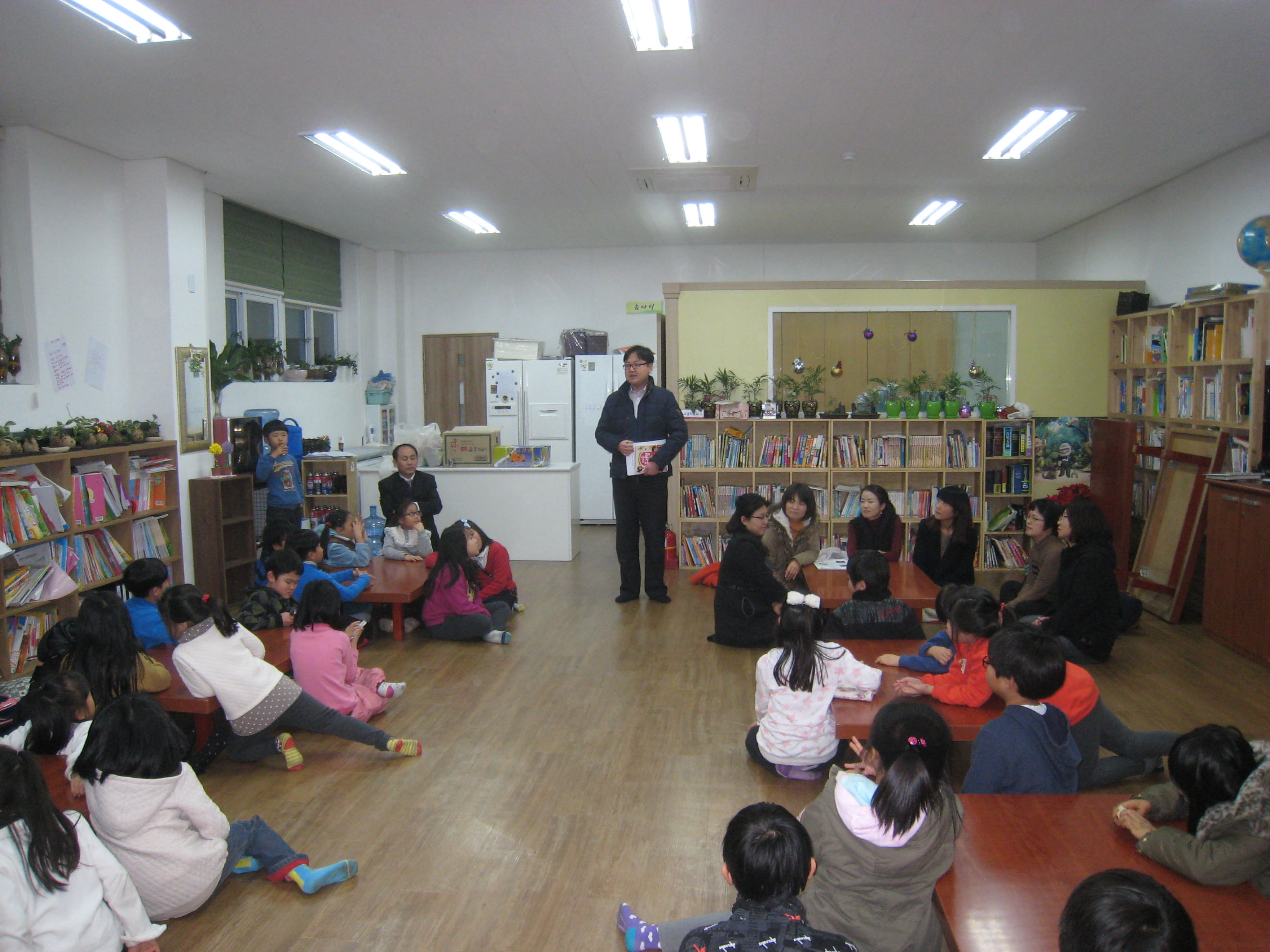 증평군 공무원으로 구성된 학습동아리 ‘우리말 사랑’(회장 김현순) 회원들이 24일 저녁 지역아동센터를 방문해 학생들을 대상으로 한글사랑교육을 실시하고 간식을 전달했다. [보도자료실 참조]