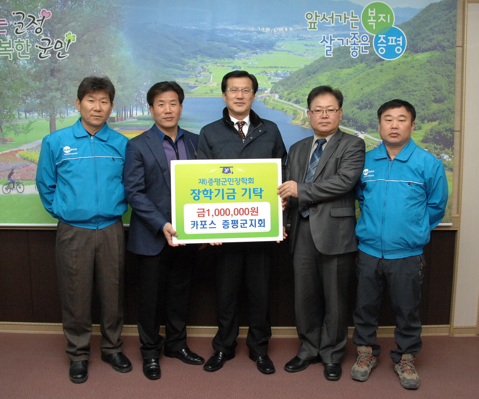 카포스 증평군지회(회장 홍상혁)는 (재)증평군민장학회(이사장 홍성열)에 1백만원을 장학기금으로 6일 기탁했다. [보도자료실 참조]