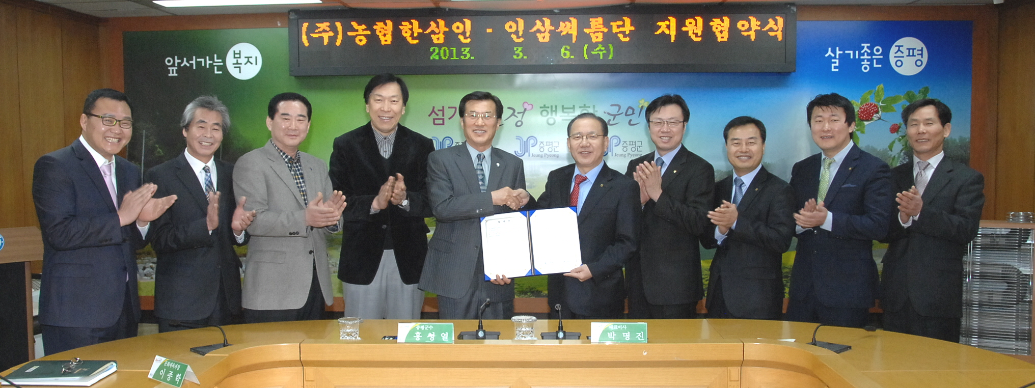 증평군청 인삼씨름단과 (주)농협한삼인은 6일 오전 10시 증평군청 소회의실에서 5,000만원 상당의 후원금 및 홍삼제품을 지원하는 지원협약을 체결했다. [보도자료실 참조]