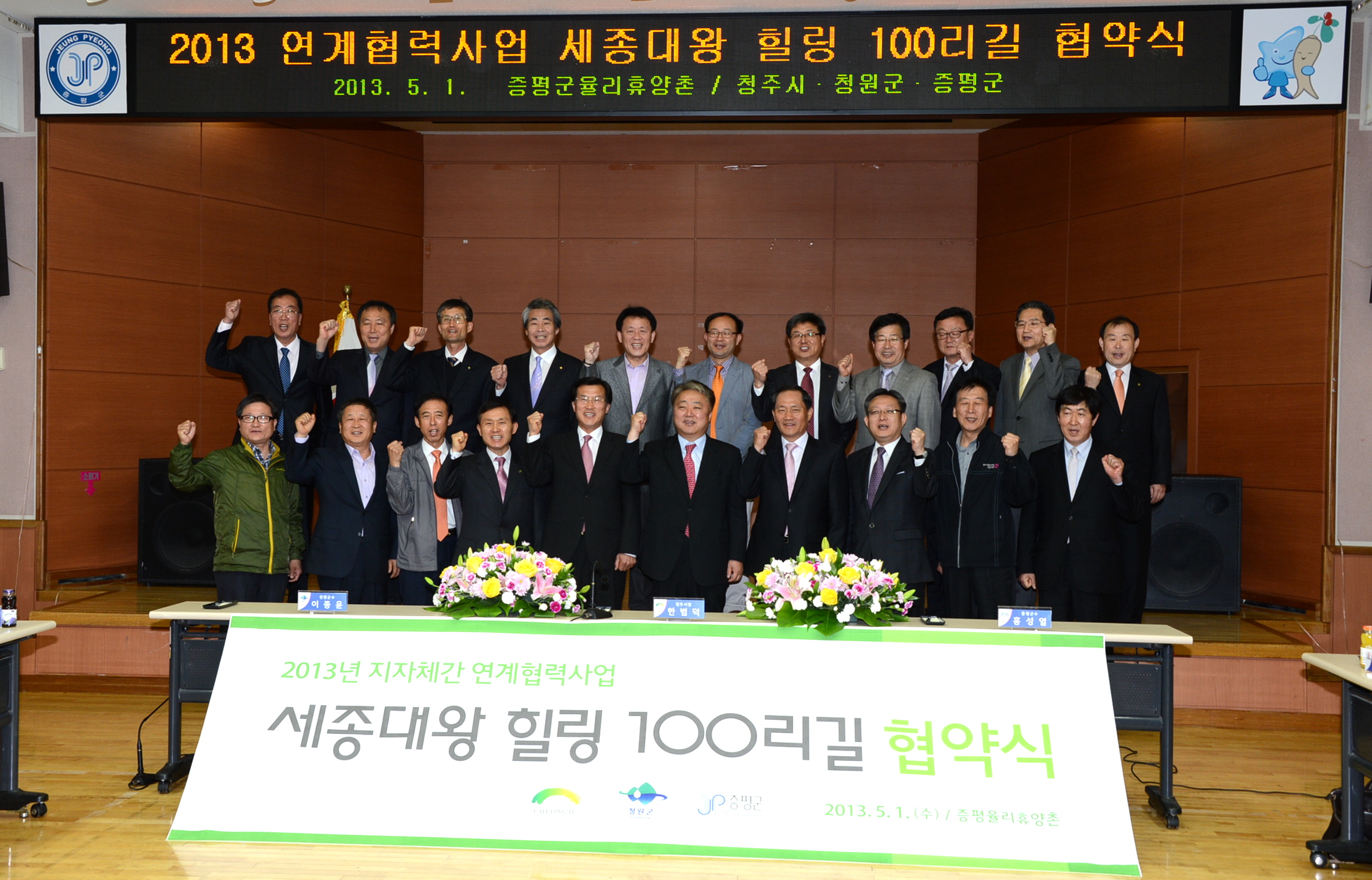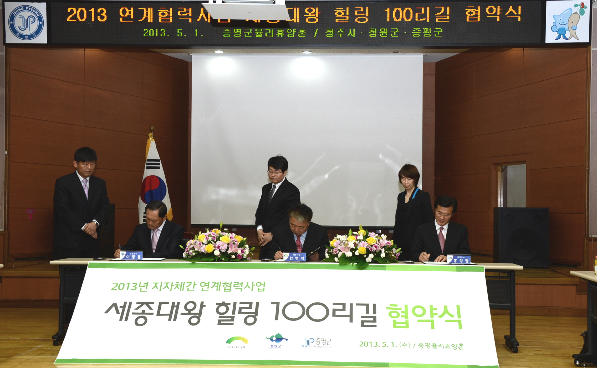 한범덕 청주시장, 이종윤 청원군수, 홍성열 증평군수는 1일 증평 율리휴양촌에서 ‘세종대왕 힐링 100리길’ 사업 추진을 위해 정책협의회를 갖고 업무협약을 체결했다.[보도자료실 참조]