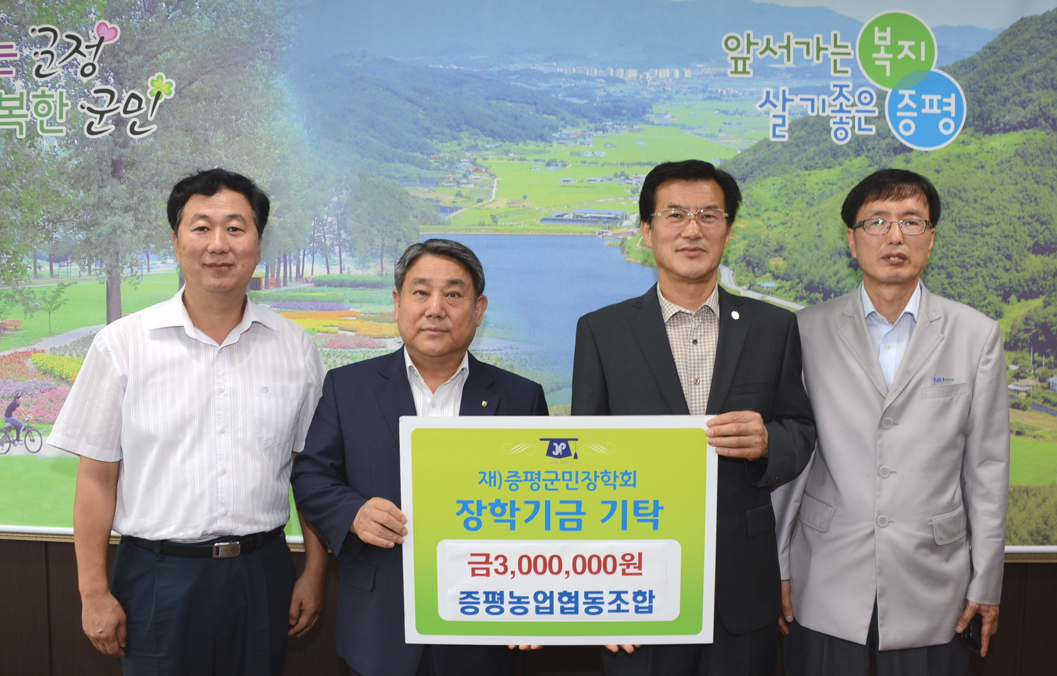 증평군 증평읍 장동리 소재 농업협동조합(조합장 김규호)에서는 11일 지역인재양성을 위해 써달라며 재)증평군민장학회(이사장 홍성열)에 300만원을 장학기금으로 기탁했다. [보도자료실 참조]