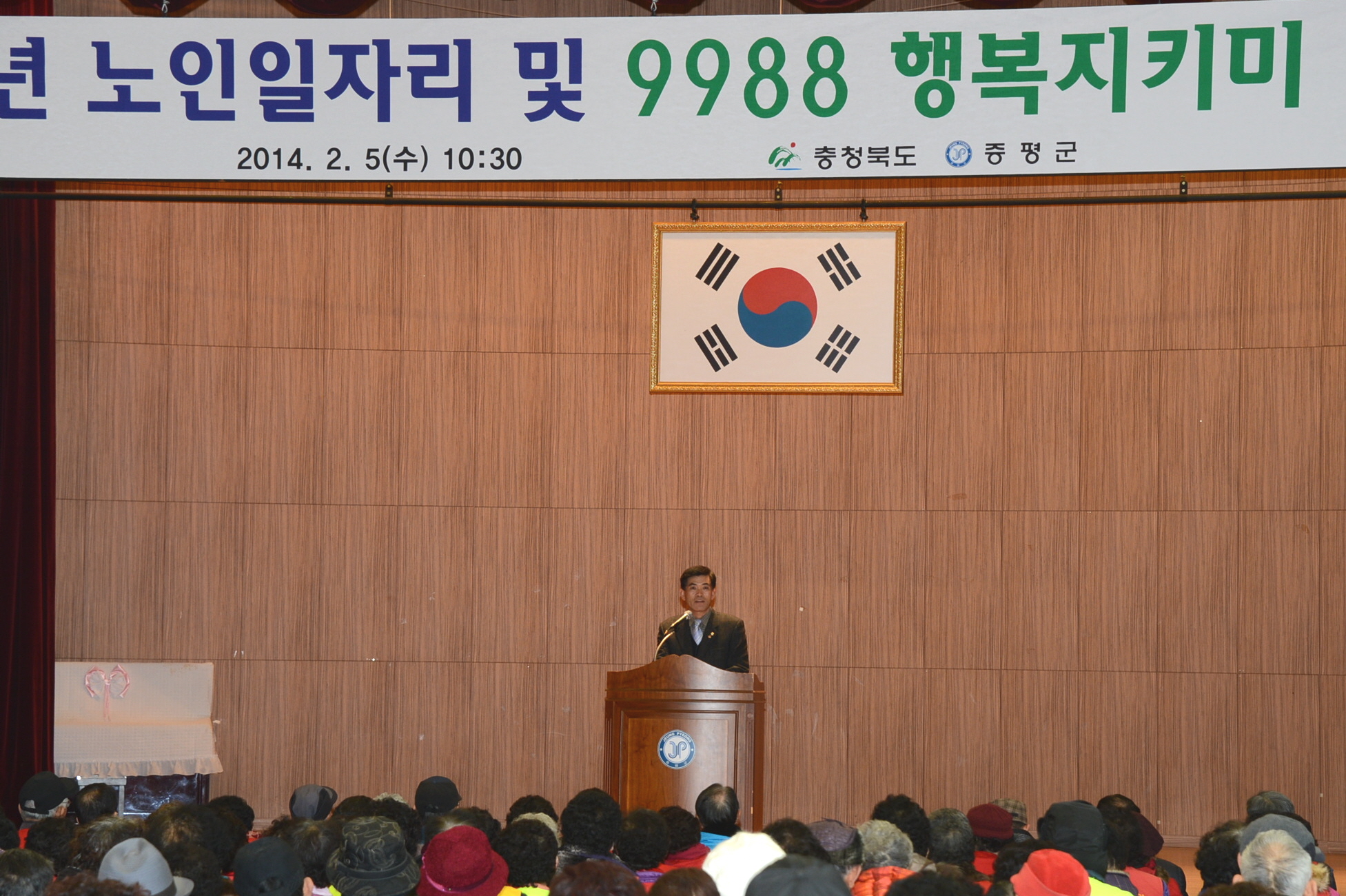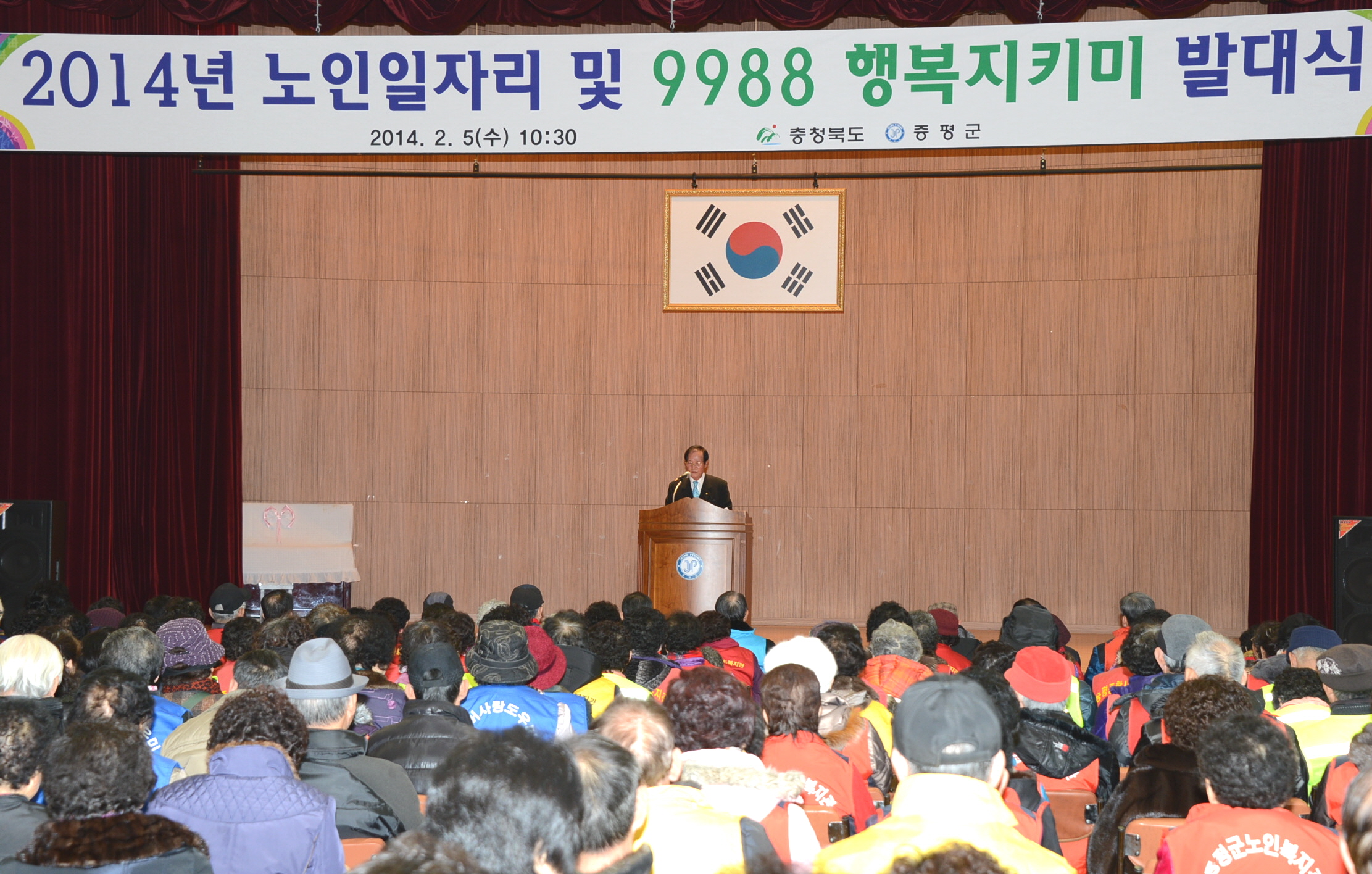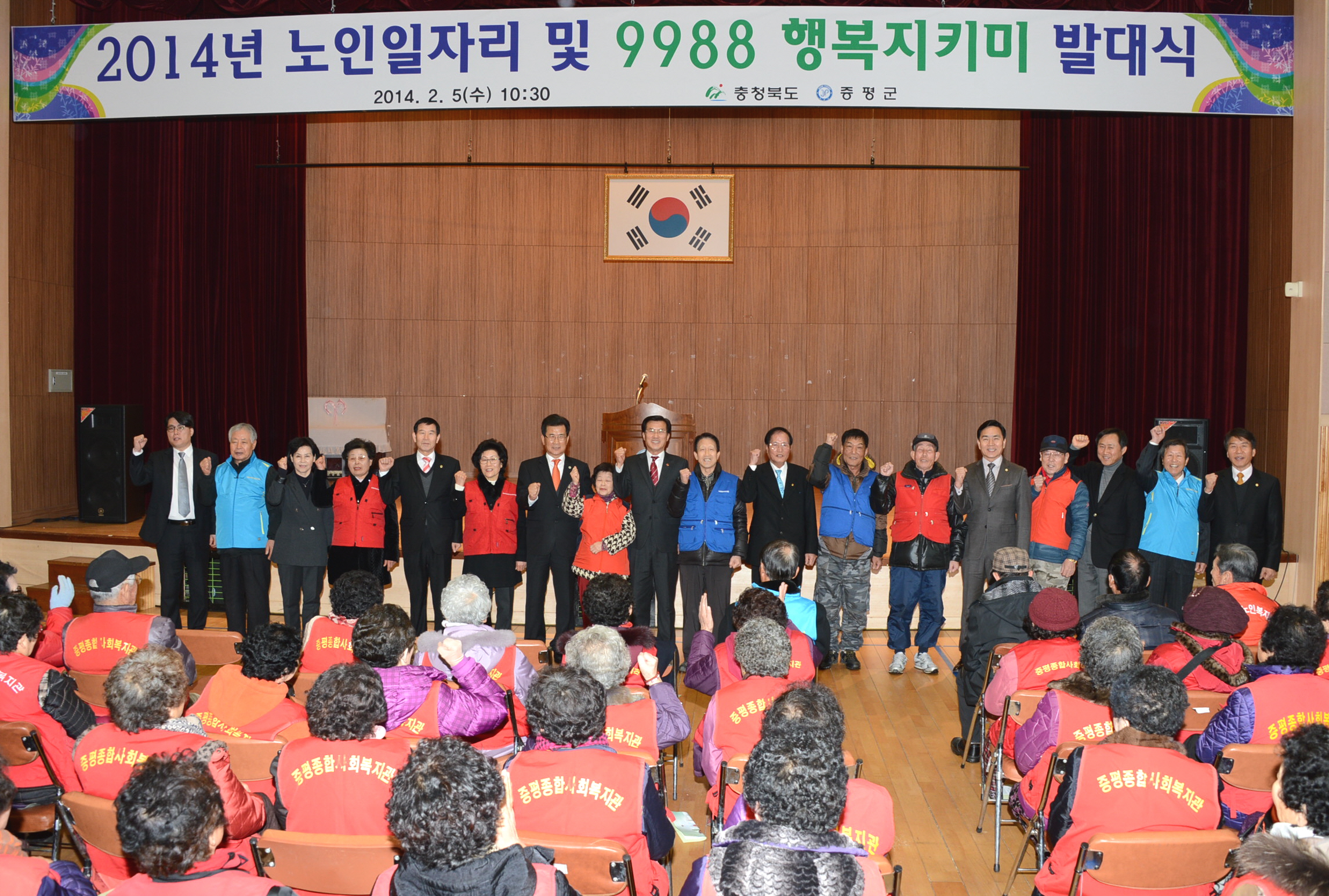 증평군은 5일 청소년수련관 대강당에서 이시종 충북지사, 홍성열 증평군수, 박석규 증평군의장 등 지역인사를 비롯해 250여명의 어르신이 참여한 가운데 ‘2014 노인일자리·9988행복지키미’ 발대식을 가졌다. [보도자료실 참조]