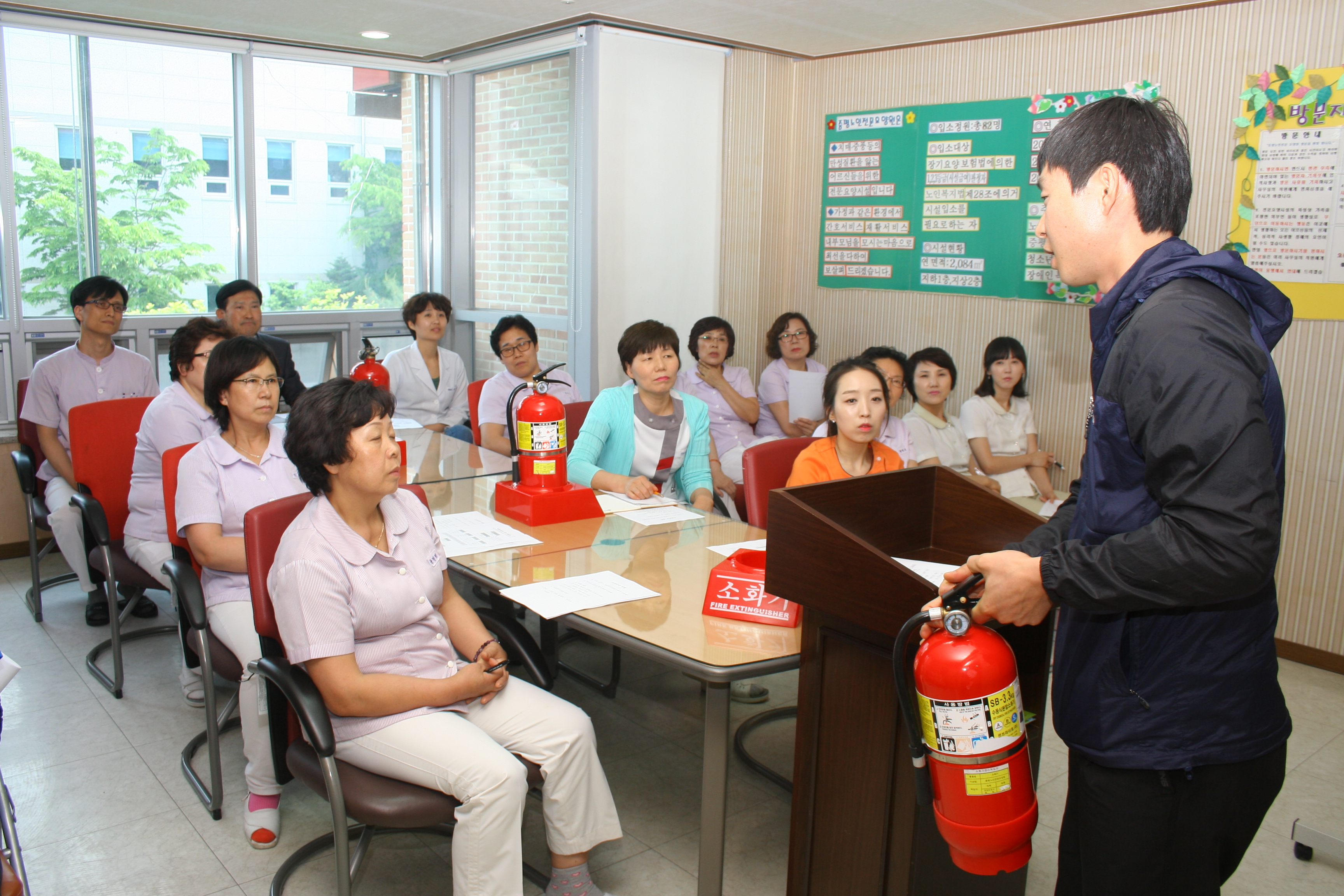 증평군 노인전문요양원(원장 이흥식)은 12일 오후2시에 입소어르신80여명, 직원 40여명 등 120여명을 대상으로 일진소방(대표 이일석)과 합동 재난대응 자체훈련을 실시했다. [증평보도자료실 참조]