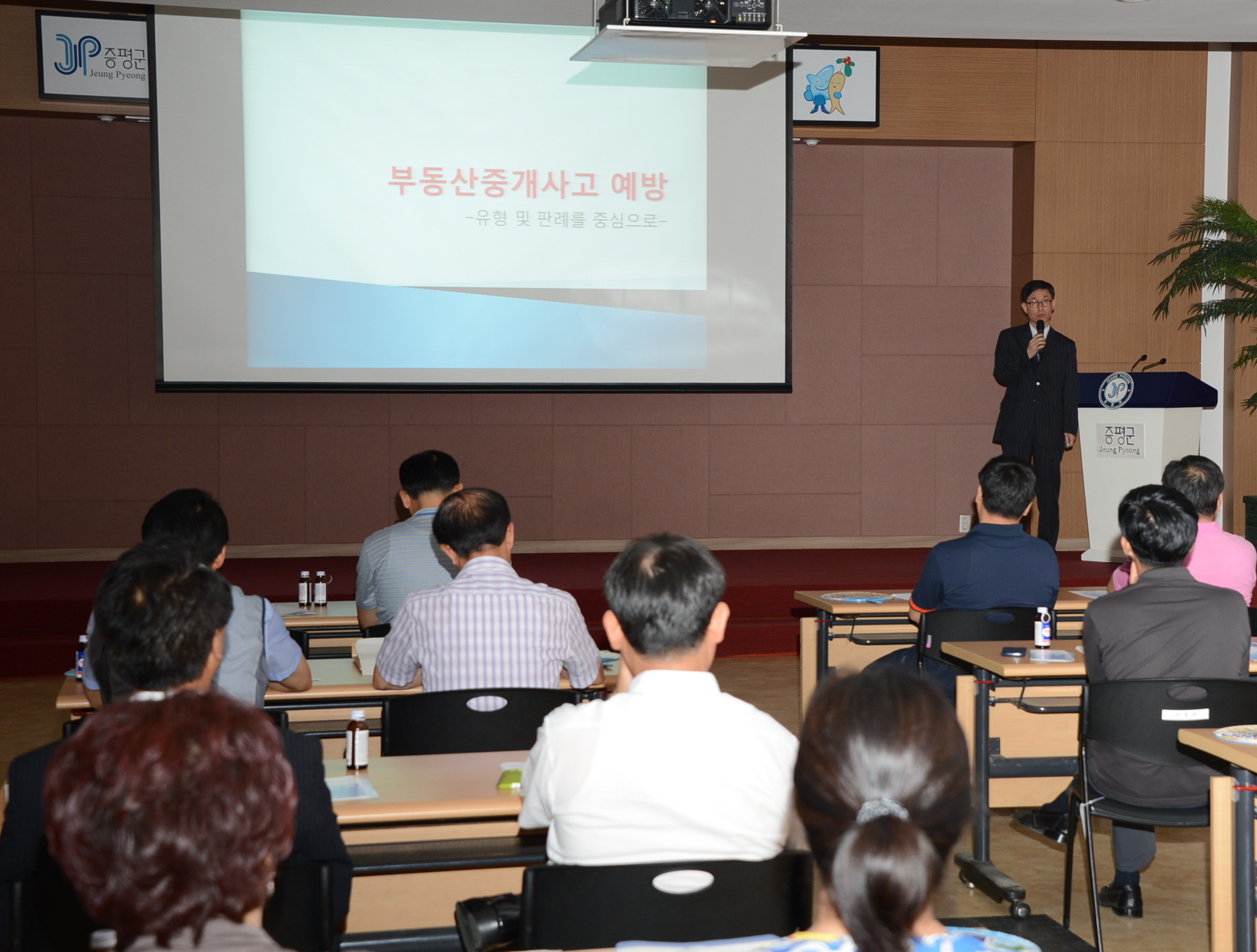 증평군은 19일 오후2시 군청 대회의실에서 건전한 부동산 거래질서 확립을 위해 중개업자 및 소속 직원 60명을 대상으로 부동산 중개업자 교육을 실시했다. [보도자료실 참조]