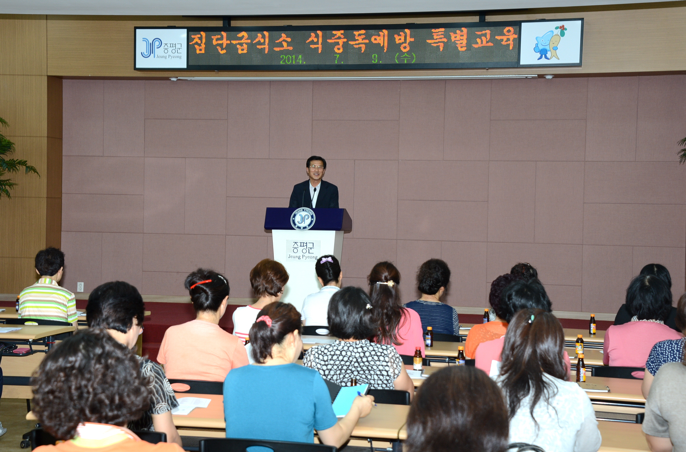 증평군은 식중독을 사전에 예방하기 위해 9일 군청 대회의실에서 집단급식소 위생관리 책임자 및 종사자 60여명을 대상으로 식중독 예방 특별교육을 실시했다. [보도자료실 참조]