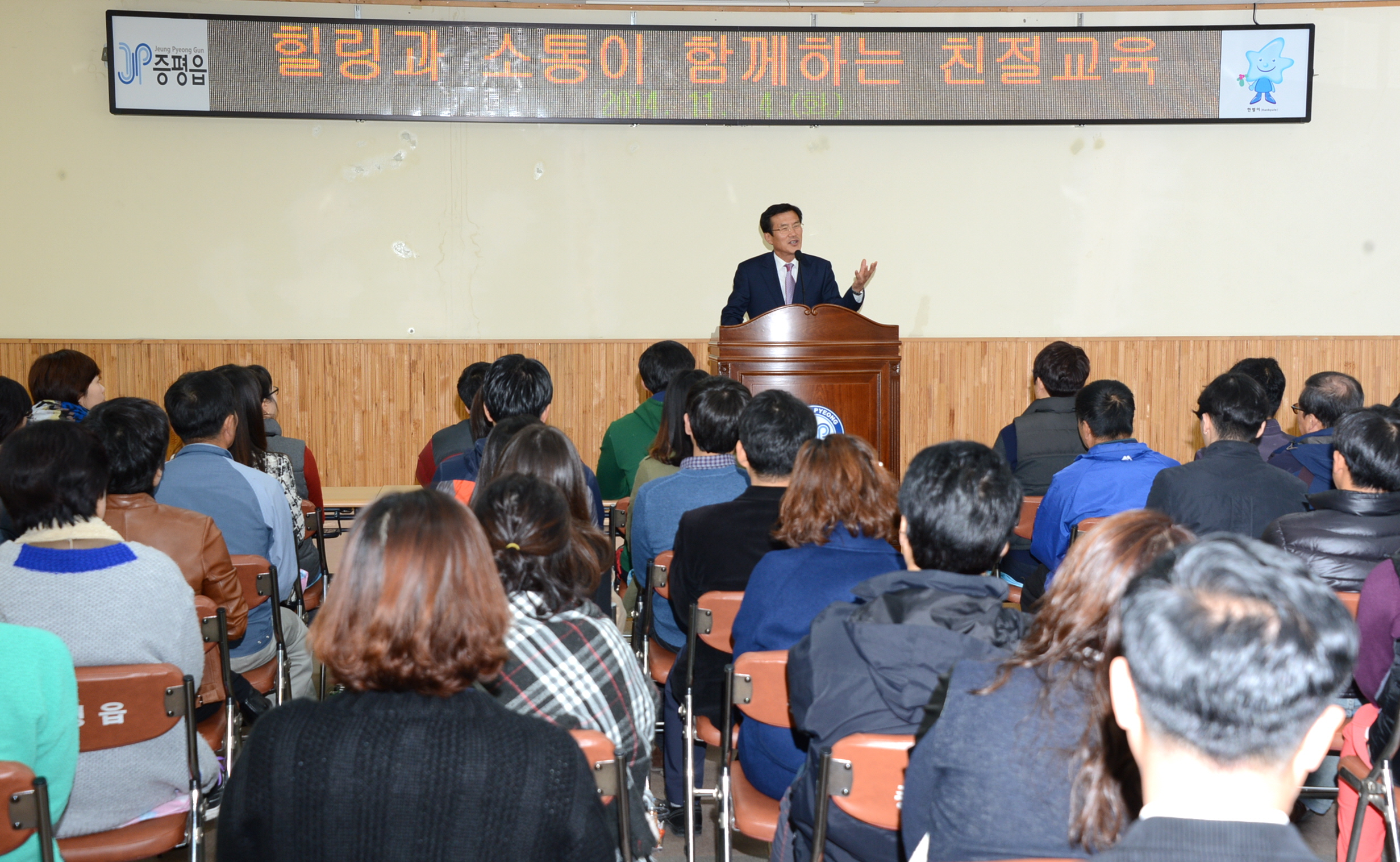 증평군은 4일 증평읍사무소 회의실에서 날로 다양해지는 고객들의 행정서비스 욕구를 충족시키고자 변화하는 공직자를 목표로 ‘힐링과 소통이 함께하는 공직자 친절교육’을 실시했다. [보도자료실 참조]